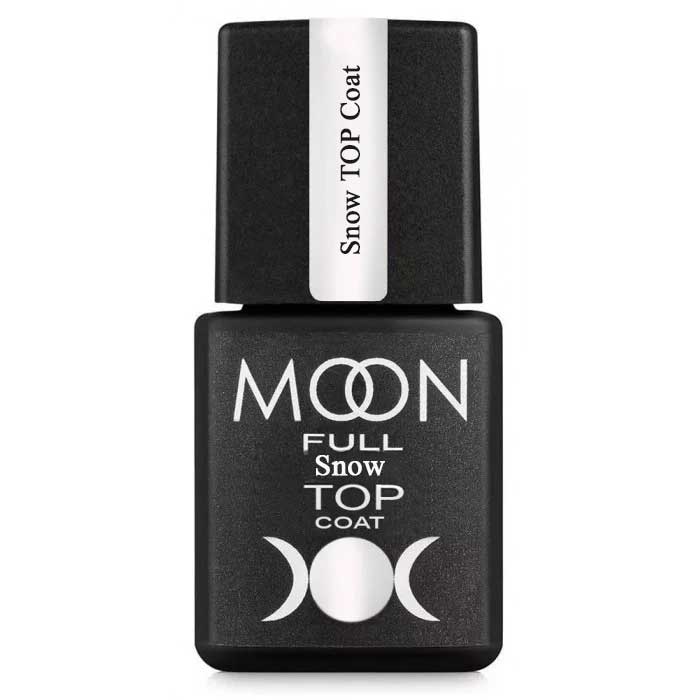 MOON FULL Snow TOP Coat, (8 ml), 1 pz. Soak Off top gel. Livellante. Lucentezza extra spessa, flessibile, bagnata, cristallina. La completa assenza di giallo nel volume. È particolarmente resistente ed elastico, non soggetto a scheggiature e screpolature, non si diffonde, non scorre sotto la cuticola e i valli laterali. Polimerizzazione LED 30 sec / UV 120 sec.