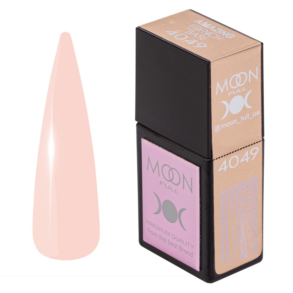 MOON Amazing French Base №AFB4049, (12 ml), 1 pz. Eccellente base di media densita’. Adatto a tutti i tipi di unghie. Non cola, autolivellante, rinforza la lamina ungueale. Compatibile con smalti gel di altre marche. Ideale per french manicure. Applicazione: Applicare 1 strato sulla lamina ungueale preparata. Polimerizzare in una lampada UV per 120 secondi, LED fino a 60-90 secondi.