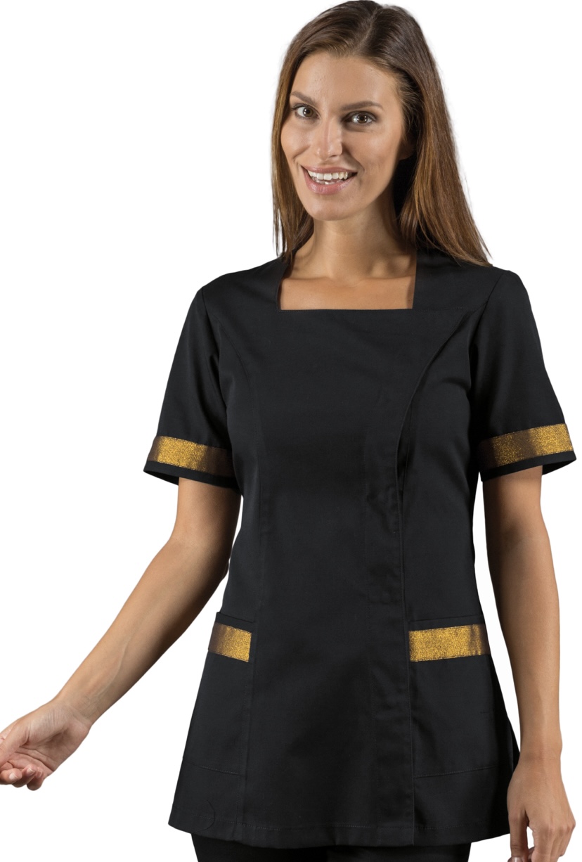 ISACCO CASACCA ABERDEEN BOHEME NERO + LUREX GOLD 100% POLYESTER BOHÉME è una camicia a mezza manica. Per settore estetico, sanitario, alimentare e medico. Utilizzata come divisa da lavoro per aziende di servizi. Con bottoni a pressione, collo squadrato, due tasche e vestibilità sciancrata. ProfessioneAssistente alla poltrona, Dentista, Estetista, Fisioterapista, Gastronomo, Maestra d'asilo, Massaggiatore, Panettiere, Parrucchiera, Pasticcere, Onicotecnica.