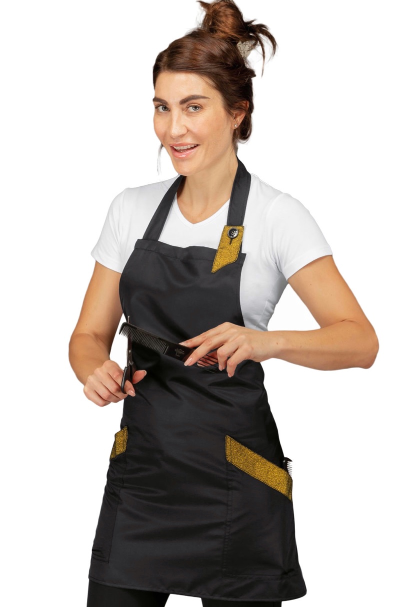 ISACCO GREMBIULE SHERRY SUPERDRY NERO + LUREX GOLD 100% POLYESTER SUPERDRY MICROFIBRA, Con 2 ampie tasche in vita ANTIMACCHIA. Ottimo Per settore estetico. Divisa da lavoro per estetiste, parrucchiere. Con allacciatura dietro al collo che ne permette la regolazione della pettorina. Professione: Barista, Gelataio.