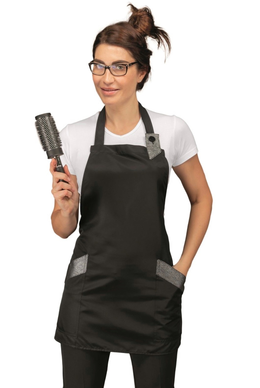 ISACCO GREMBIULE SHERRY SUPERDRY NERO + LUREX SILVER 100% POLYESTER SUPERDRY MICROFIBRA, Con 2 ampie tasche in vita ANTIMACCHIA. Ottimo Per settore estetico. Divisa da lavoro per estetiste, parrucchiere. Con allacciatura dietro al collo che ne permette la regolazione della pettorina. Professione: Barista, Gelataio.