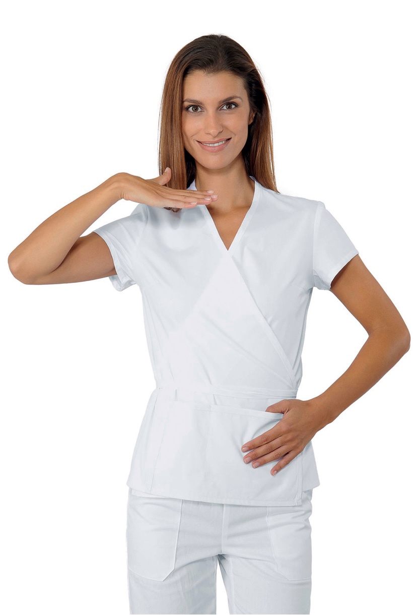 ISACCO KIMONO TONGA BIANCO 65% POLYESTER  35% COTTON è un kimono corto. Per settore estetico, parrucchieri e sanitario. Utilizzata come divisa da lavoro per estetista. Professione: Estetista, Fisioterapista, Massaggiatore, Parrucchiera, Onicotecnica.