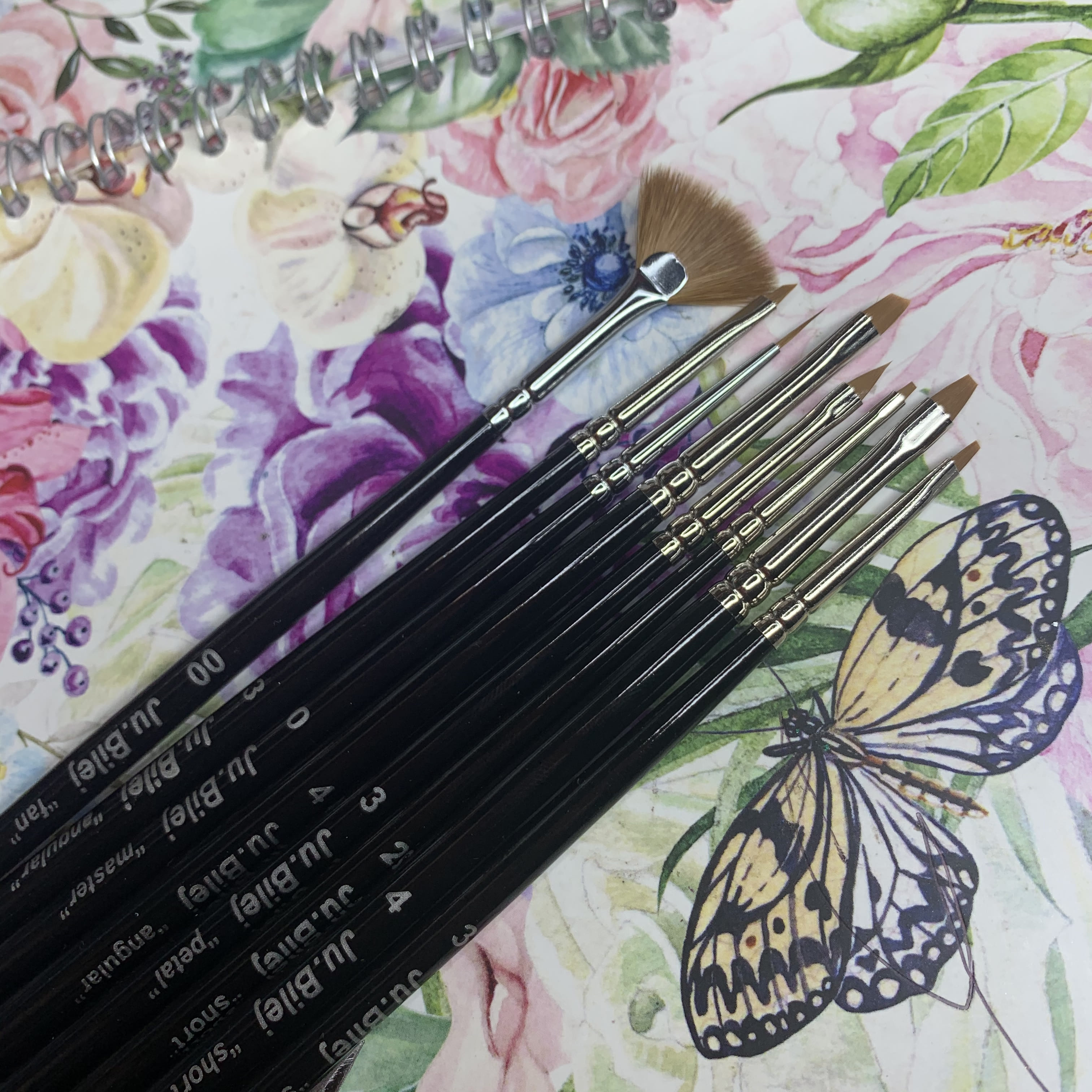 ROUBLOFF Kit dei pennelli Juliya Biley №5 One stroke maxi, 1 pz. Questo è un kit versatile di pennelli piatti che possono funzionare con gel, smalto gel e vernice acrilica. Il kit contiene pennelli per tutti i tipi di tratti, linee e disegni: geometria, francese, sfregamento, monogrammi, ecc. Si consiglia di utilizzare i pennelli anche nelle tecniche di ombreggiatura, sfumatura o ombre. I rappresentanti più sottili del kit ti aiuteranno a portare il lavoro all'ideale, disegnando il gel esattamente sotto la cuticola.Composizione del set: "Ventilatore" №00"Corto" №2"Corto" №3"Corto" №4"Petalo" №3"Angolo" №3"Angolo" №4"Maestro" №0