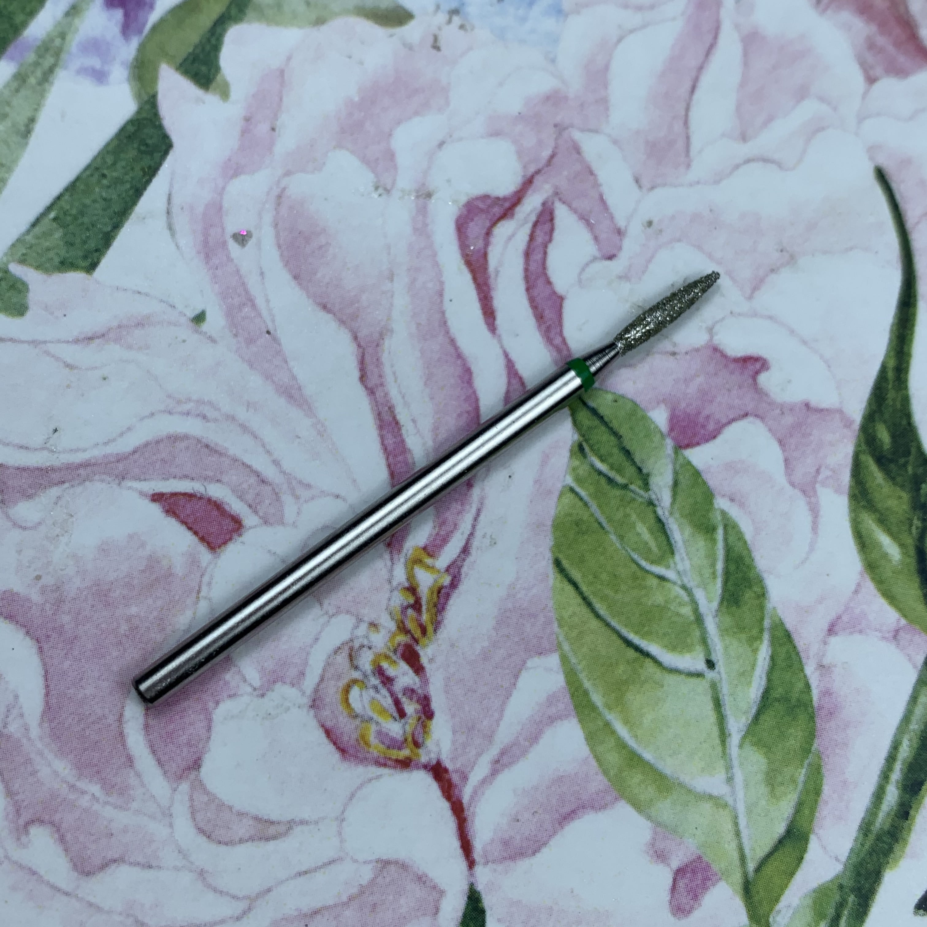 MATRIOSHKANAIL Punta diamantata, fiamma, fascia verde Ø16, 1 pz .Punta si usa per alzare e rimuovere le cuticole, per i valli laterali, per rimuovere i sollevamenti durante il refill. Si puo’ sterilizzare e disinfettare.