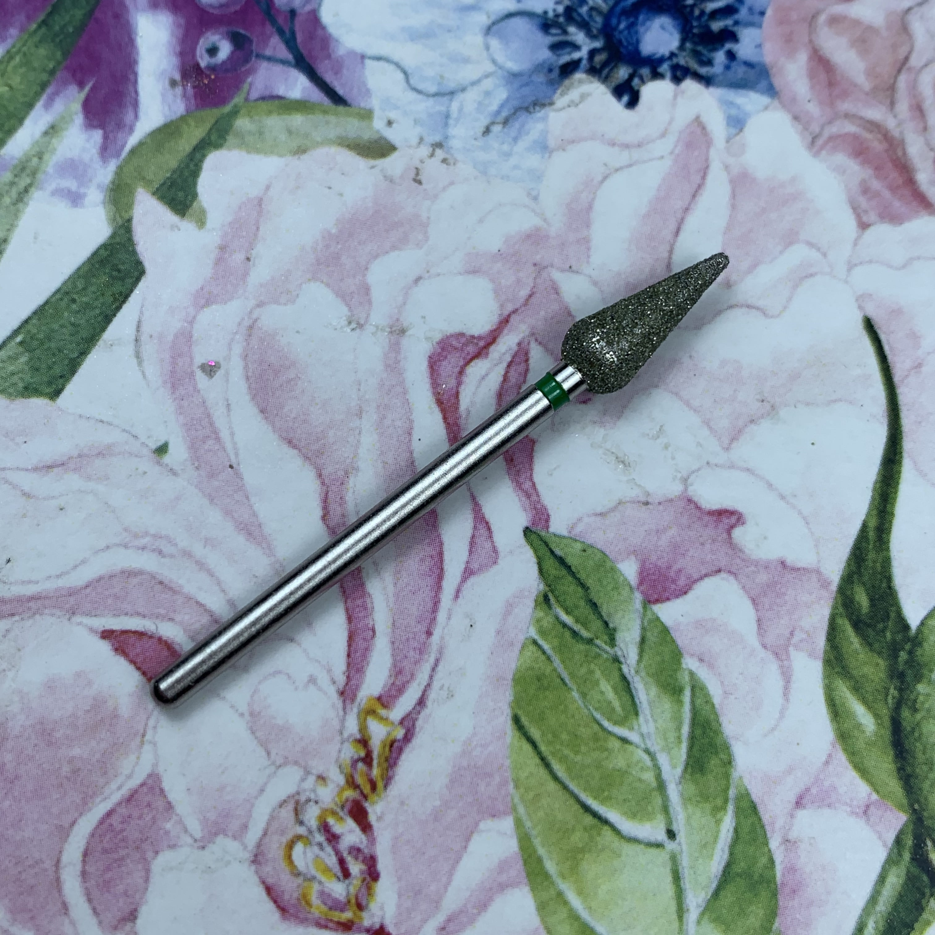 MATRIOSHKANAIL Punta diamantata, goccia, fascia verde Ø50, 1 pz .Punta si usa per alzare e rimuovere le cuticole, per i valli laterali, per rimuovere i sollevamenti durante il refill. Si puo’ sterilizzare e disinfettare.