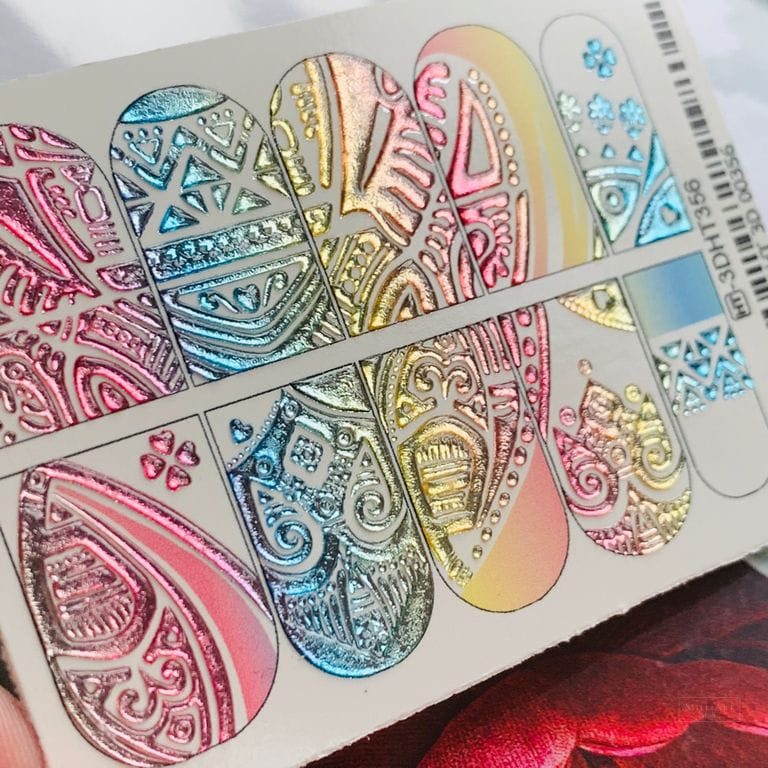ANNA TKACHEVA Water decal 3D Crystal HT3D356, 1 pz. Istruzioni per l'uso: 1. Effettuare una preparazione standard della lamina ungueale.2. Selezionare il modello appropriato, tagliare l'immagine alla dimensione dell'unghia. 3. Applicare la base,polimerizzare. Applicare uno strato sottile del semipermanente bianco, se richiesto dal design del water decal. Polimerizzare. 4. Applicare uno strato sottile della base. Non polimerizzare. 5. Mettere il water decal su un disco di cotone inumidito con acqua calda (non fredda!) Per circa 10-15 secondi. Spostarlo trasferendo la pellicola sull'unghia. Raddrizzare la pellicola, tirando leggermente verso l'alto il bordo libero. Distendere con cura le pieghe, estraendo i resti di aria e acqua con un panno morbido, un pennello piatto o con le dita. Polimerizzare a tempo pieno. (UV - 2 min, led -30-60 sec). 6. Utilizzando la lima fine, dall'alto verso il basso, rimuovere delicatamente la pellicola in eccesso dal bordo libero dell'unghia. 7. Coprire 2 volte con il top coat, ben sigillando il bordo libero.