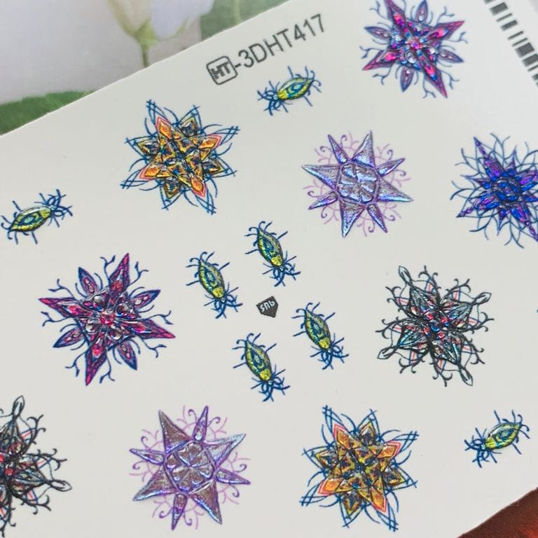 ANNA TKACHEVA Water decal 3D Crystal HT3D417, 1 pz. Istruzioni per l'uso: 1. Effettuare una preparazione standard della lamina ungueale.2. Selezionare il modello appropriato, tagliare l'immagine alla dimensione dell'unghia. 3. Applicare la base,polimerizzare. Applicare uno strato sottile del semipermanente bianco, se richiesto dal design del water decal. Polimerizzare. 4. Applicare uno strato sottile della base. Non polimerizzare. 5. Mettere il water decal su un disco di cotone inumidito con acqua calda (non fredda!) Per circa 10-15 secondi. Spostarlo trasferendo la pellicola sull'unghia. Raddrizzare la pellicola, tirando leggermente verso l'alto il bordo libero. Distendere con cura le pieghe, estraendo i resti di aria e acqua con un panno morbido, un pennello piatto o con le dita. Polimerizzare a tempo pieno. (UV - 2 min, led -30-60 sec). 6. Utilizzando la lima fine, dall'alto verso il basso, rimuovere delicatamente la pellicola in eccesso dal bordo libero dell'unghia. 7. Coprire 2 volte con il top coat, ben sigillando il bordo libero.