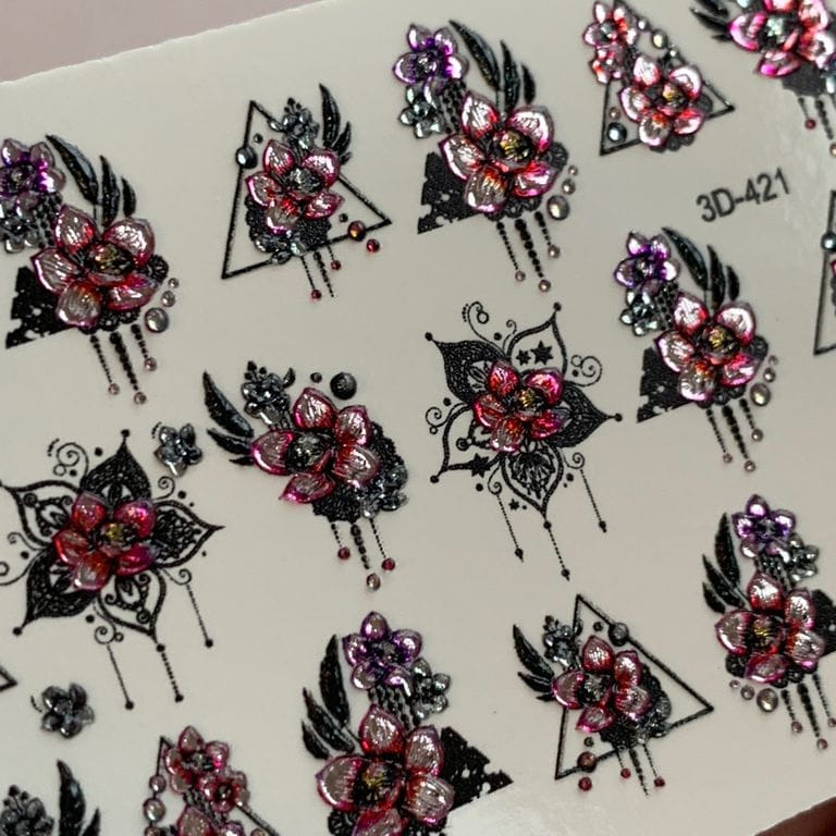 ANNA TKACHEVA Water decal 3D Crystal HT3D421, 1 pz. Istruzioni per l'uso: 1. Effettuare una preparazione standard della lamina ungueale.2. Selezionare il modello appropriato, tagliare l'immagine alla dimensione dell'unghia. 3. Applicare la base,polimerizzare. Applicare uno strato sottile del semipermanente bianco, se richiesto dal design del water decal. Polimerizzare. 4. Applicare uno strato sottile della base. Non polimerizzare. 5. Mettere il water decal su un disco di cotone inumidito con acqua calda (non fredda!) Per circa 10-15 secondi. Spostarlo trasferendo la pellicola sull'unghia. Raddrizzare la pellicola, tirando leggermente verso l'alto il bordo libero. Distendere con cura le pieghe, estraendo i resti di aria e acqua con un panno morbido, un pennello piatto o con le dita. Polimerizzare a tempo pieno. (UV - 2 min, led -30-60 sec). 6. Utilizzando la lima fine, dall'alto verso il basso, rimuovere delicatamente la pellicola in eccesso dal bordo libero dell'unghia. 7. Coprire 2 volte con il top coat, ben sigillando il bordo libero.