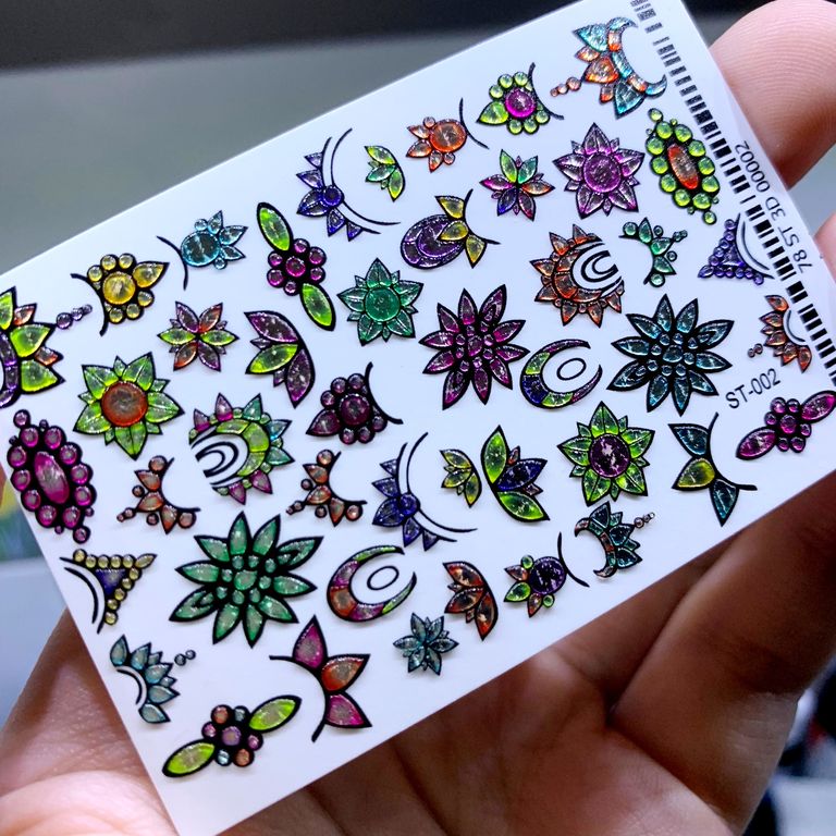 ANNA TKACHEVA Water decal 3D Crystal ST-002, 1 pz. Istruzioni per l'uso: 1. Effettuare una preparazione standard della lamina ungueale.2. Selezionare il modello appropriato, tagliare l'immagine alla dimensione dell'unghia. 3. Applicare la base,polimerizzare. Applicare uno strato sottile del semipermanente bianco, se richiesto dal design del water decal. Polimerizzare. 4. Applicare uno strato sottile della base. Non polimerizzare. 5. Mettere il water decal su un disco di cotone inumidito con acqua calda (non fredda!) Per circa 10-15 secondi. Spostarlo trasferendo la pellicola sull'unghia. Raddrizzare la pellicola, tirando leggermente verso l'alto il bordo libero. Distendere con cura le pieghe, estraendo i resti di aria e acqua con un panno morbido, un pennello piatto o con le dita. Polimerizzare a tempo pieno. (UV - 2 min, led -30-60 sec). 6. Utilizzando la lima fine, dall'alto verso il basso, rimuovere delicatamente la pellicola in eccesso dal bordo libero dell'unghia. 7. Coprire 2 volte con il top coat, ben sigillando il bordo libero.