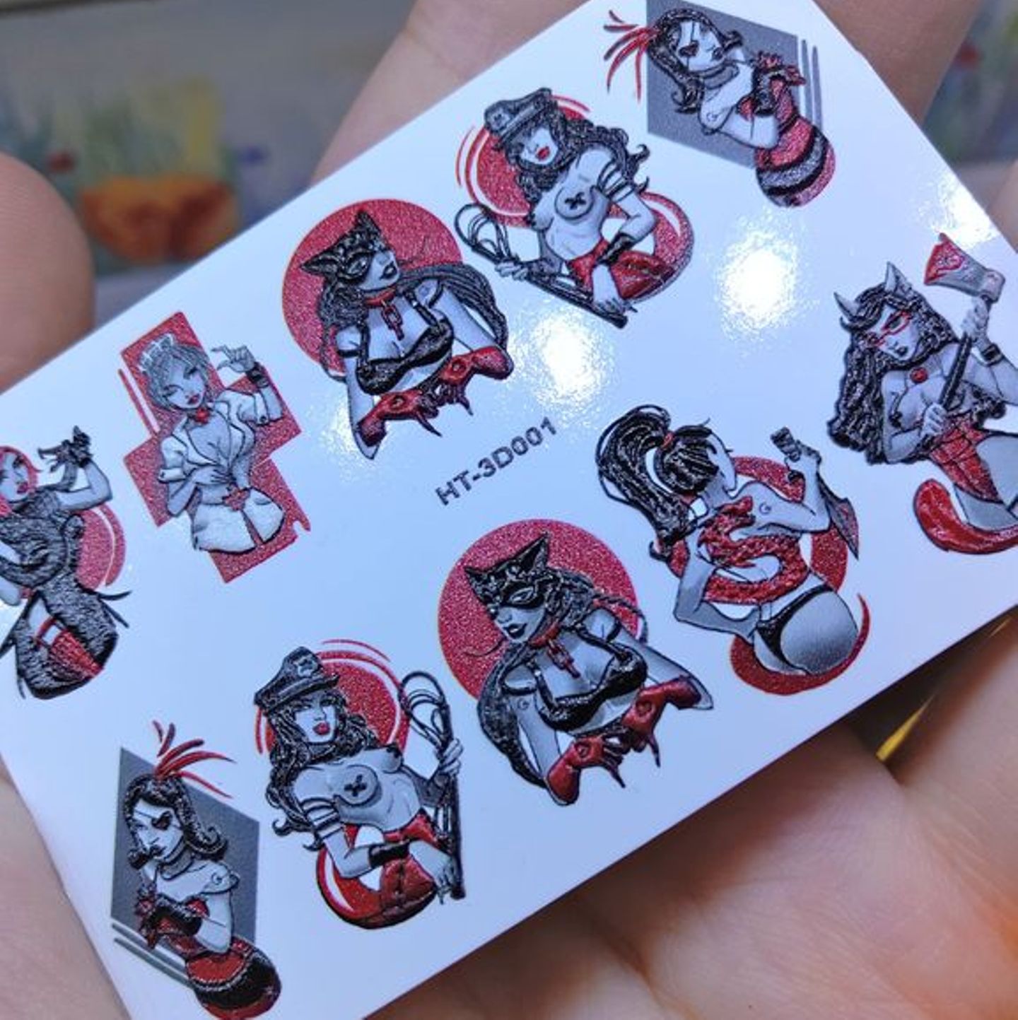ANNA TKACHEVA Water decal 3D HT 3D001, 1 pz. Istruzioni per l'uso: 1. Effettuare una preparazione standard della lamina ungueale.2. Selezionare il modello appropriato, tagliare l'immagine alla dimensione dell'unghia. 3. Applicare la base,polimerizzare. Applicare uno strato sottile del semipermanente bianco, se richiesto dal design del water decal. Polimerizzare. 4. Applicare uno strato sottile della base. Non polimerizzare. 5. Mettere il water decal su un disco di cotone inumidito con acqua calda (non fredda!) Per circa 10-15 secondi. Spostarlo trasferendo la pellicola sull'unghia. Raddrizzare la pellicola, tirando leggermente verso l'alto il bordo libero. Distendere con cura le pieghe, estraendo i resti di aria e acqua con un panno morbido, un pennello piatto o con le dita. Polimerizzare a tempo pieno. (UV - 2 min, led -30-60 sec). 6. Utilizzando la lima fine, dall'alto verso il basso, rimuovere delicatamente la pellicola in eccesso dal bordo libero dell'unghia. 7. Coprire 2 volte con il top coat, ben sigillando il bordo libero.