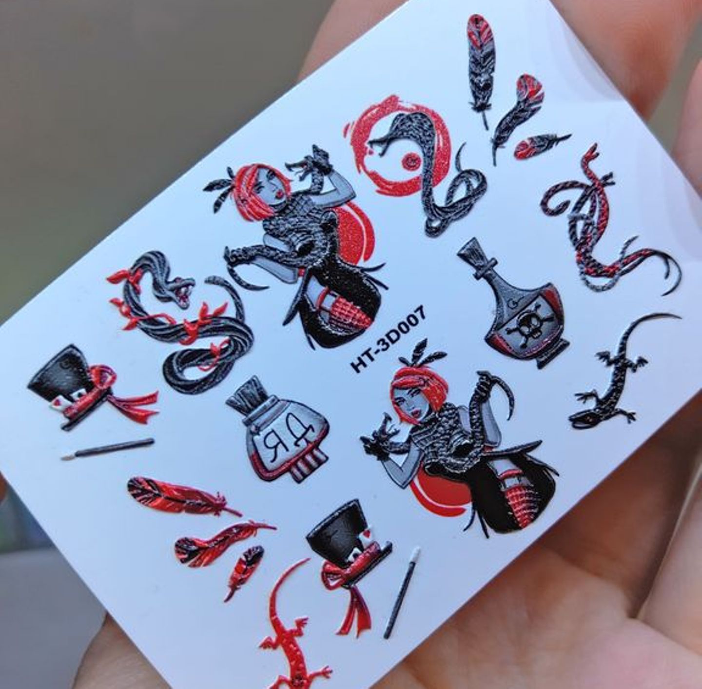 ANNA TKACHEVA Water decal 3D HT 3D007, 1 pz. Istruzioni per l'uso: 1. Effettuare una preparazione standard della lamina ungueale.2. Selezionare il modello appropriato, tagliare l'immagine alla dimensione dell'unghia. 3. Applicare la base,polimerizzare. Applicare uno strato sottile del semipermanente bianco, se richiesto dal design del water decal. Polimerizzare. 4. Applicare uno strato sottile della base. Non polimerizzare. 5. Mettere il water decal su un disco di cotone inumidito con acqua calda (non fredda!) Per circa 10-15 secondi. Spostarlo trasferendo la pellicola sull'unghia. Raddrizzare la pellicola, tirando leggermente verso l'alto il bordo libero. Distendere con cura le pieghe, estraendo i resti di aria e acqua con un panno morbido, un pennello piatto o con le dita. Polimerizzare a tempo pieno. (UV - 2 min, led -30-60 sec). 6. Utilizzando la lima fine, dall'alto verso il basso, rimuovere delicatamente la pellicola in eccesso dal bordo libero dell'unghia. 7. Coprire 2 volte con il top coat, ben sigillando il bordo libero.