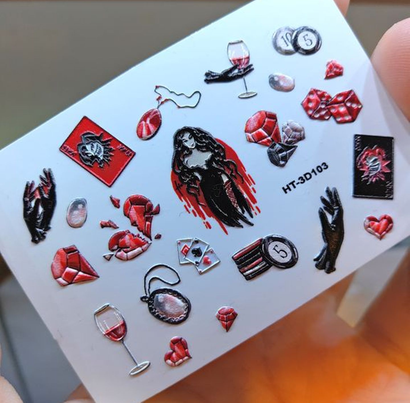 ANNA TKACHEVA Water decal 3D HT 3D103, 1 pz. Istruzioni per l'uso: 1. Effettuare una preparazione standard della lamina ungueale.2. Selezionare il modello appropriato, tagliare l'immagine alla dimensione dell'unghia. 3. Applicare la base,polimerizzare. Applicare uno strato sottile del semipermanente bianco, se richiesto dal design del water decal. Polimerizzare. 4. Applicare uno strato sottile della base. Non polimerizzare. 5. Mettere il water decal su un disco di cotone inumidito con acqua calda (non fredda!) Per circa 10-15 secondi. Spostarlo trasferendo la pellicola sull'unghia. Raddrizzare la pellicola, tirando leggermente verso l'alto il bordo libero. Distendere con cura le pieghe, estraendo i resti di aria e acqua con un panno morbido, un pennello piatto o con le dita. Polimerizzare a tempo pieno. (UV - 2 min, led -30-60 sec). 6. Utilizzando la lima fine, dall'alto verso il basso, rimuovere delicatamente la pellicola in eccesso dal bordo libero dell'unghia. 7. Coprire 2 volte con il top coat, ben sigillando il bordo libero.