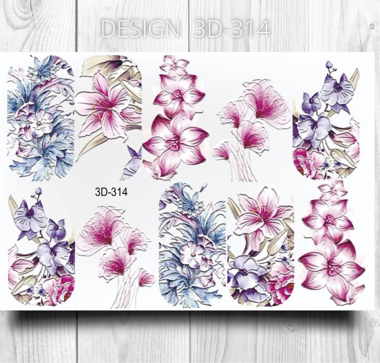 ANNA TKACHEVA Water decal 3D 314, 1 pz. Istruzioni per l'uso: 1. Effettuare una preparazione standard della lamina ungueale.2. Selezionare il modello appropriato, tagliare l'immagine alla dimensione dell'unghia. 3. Applicare la base,polimerizzare. Applicare uno strato sottile del semipermanente bianco, se richiesto dal design del water decal. Polimerizzare. 4. Applicare uno strato sottile della base. Non polimerizzare. 5. Mettere il water decal su un disco di cotone inumidito con acqua calda (non fredda!) Per circa 10-15 secondi. Spostarlo trasferendo la pellicola sull'unghia. Raddrizzare la pellicola, tirando leggermente verso l'alto il bordo libero. Distendere con cura le pieghe, estraendo i resti di aria e acqua con un panno morbido, un pennello piatto o con le dita. Polimerizzare a tempo pieno. (UV - 2 min, led -30-60 sec). 6. Utilizzando la lima fine, dall'alto verso il basso, rimuovere delicatamente la pellicola in eccesso dal bordo libero dell'unghia. 7. Coprire 2 volte con il top coat, ben sigillando il bordo libero.