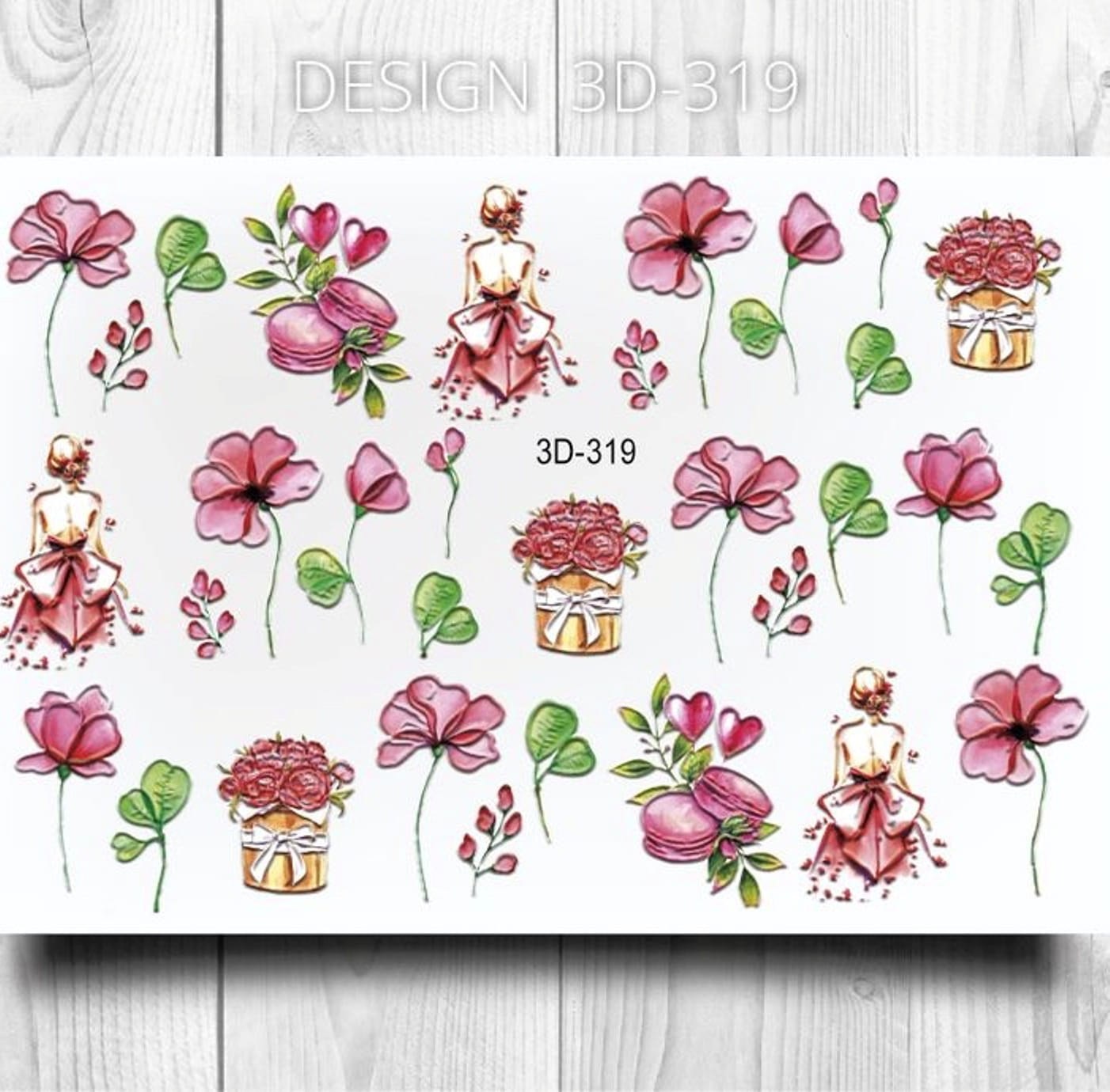 ANNA TKACHEVA Water decal 3D 319, 1 pz. Istruzioni per l'uso: 1. Effettuare una preparazione standard della lamina ungueale.2. Selezionare il modello appropriato, tagliare l'immagine alla dimensione dell'unghia. 3. Applicare la base,polimerizzare. Applicare uno strato sottile del semipermanente bianco, se richiesto dal design del water decal. Polimerizzare. 4. Applicare uno strato sottile della base. Non polimerizzare. 5. Mettere il water decal su un disco di cotone inumidito con acqua calda (non fredda!) Per circa 10-15 secondi. Spostarlo trasferendo la pellicola sull'unghia. Raddrizzare la pellicola, tirando leggermente verso l'alto il bordo libero. Distendere con cura le pieghe, estraendo i resti di aria e acqua con un panno morbido, un pennello piatto o con le dita. Polimerizzare a tempo pieno. (UV - 2 min, led -30-60 sec). 6. Utilizzando la lima fine, dall'alto verso il basso, rimuovere delicatamente la pellicola in eccesso dal bordo libero dell'unghia. 7. Coprire 2 volte con il top coat, ben sigillando il bordo libero.