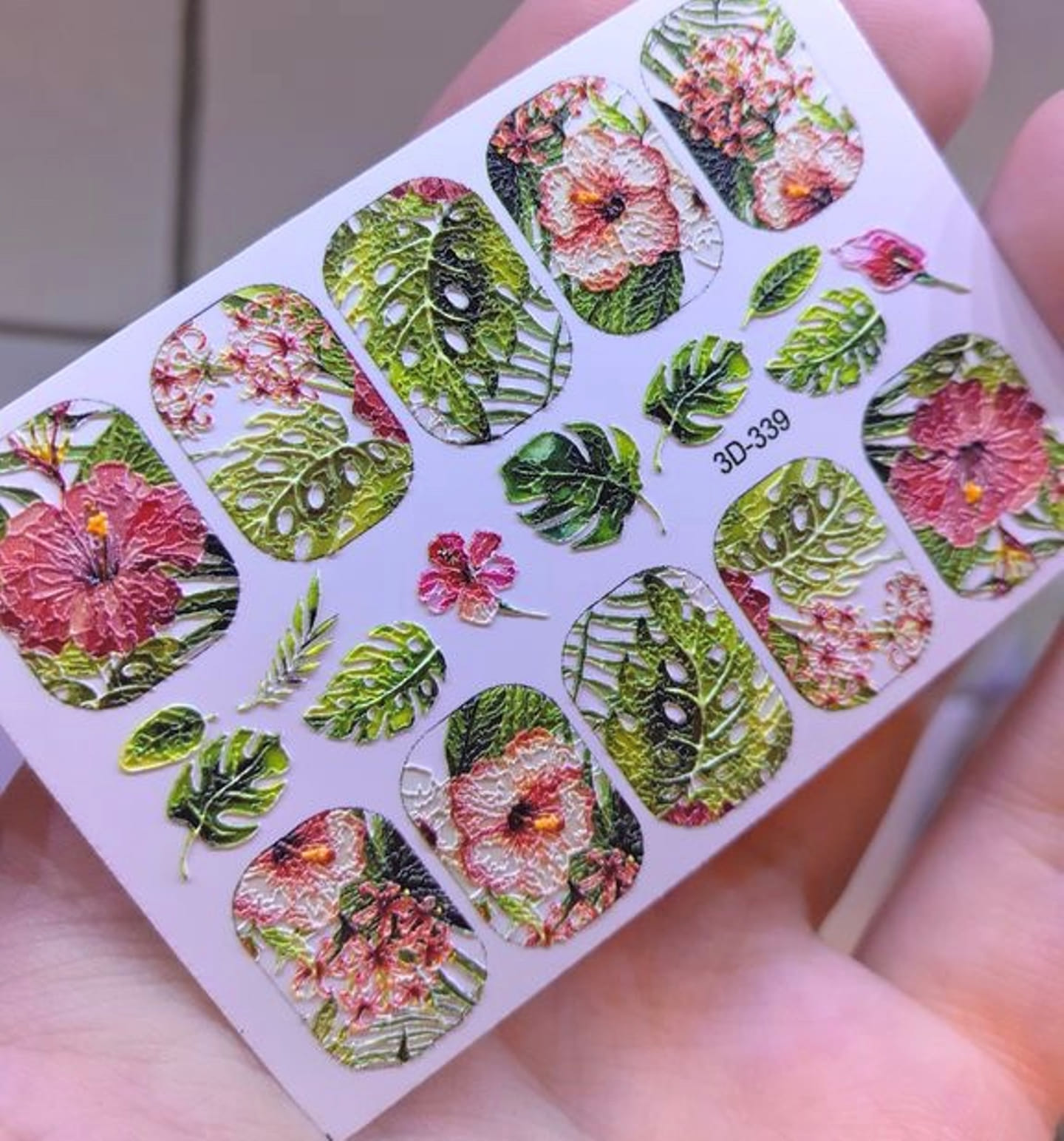 ANNA TKACHEVA Water decal 3D 339, 1 pz. Istruzioni per l'uso: 1. Effettuare una preparazione standard della lamina ungueale.2. Selezionare il modello appropriato, tagliare l'immagine alla dimensione dell'unghia. 3. Applicare la base,polimerizzare. Applicare uno strato sottile del semipermanente bianco, se richiesto dal design del water decal. Polimerizzare. 4. Applicare uno strato sottile della base. Non polimerizzare. 5. Mettere il water decal su un disco di cotone inumidito con acqua calda (non fredda!) Per circa 10-15 secondi. Spostarlo trasferendo la pellicola sull'unghia. Raddrizzare la pellicola, tirando leggermente verso l'alto il bordo libero. Distendere con cura le pieghe, estraendo i resti di aria e acqua con un panno morbido, un pennello piatto o con le dita. Polimerizzare a tempo pieno. (UV - 2 min, led -30-60 sec). 6. Utilizzando la lima fine, dall'alto verso il basso, rimuovere delicatamente la pellicola in eccesso dal bordo libero dell'unghia. 7. Coprire 2 volte con il top coat, ben sigillando il bordo libero.