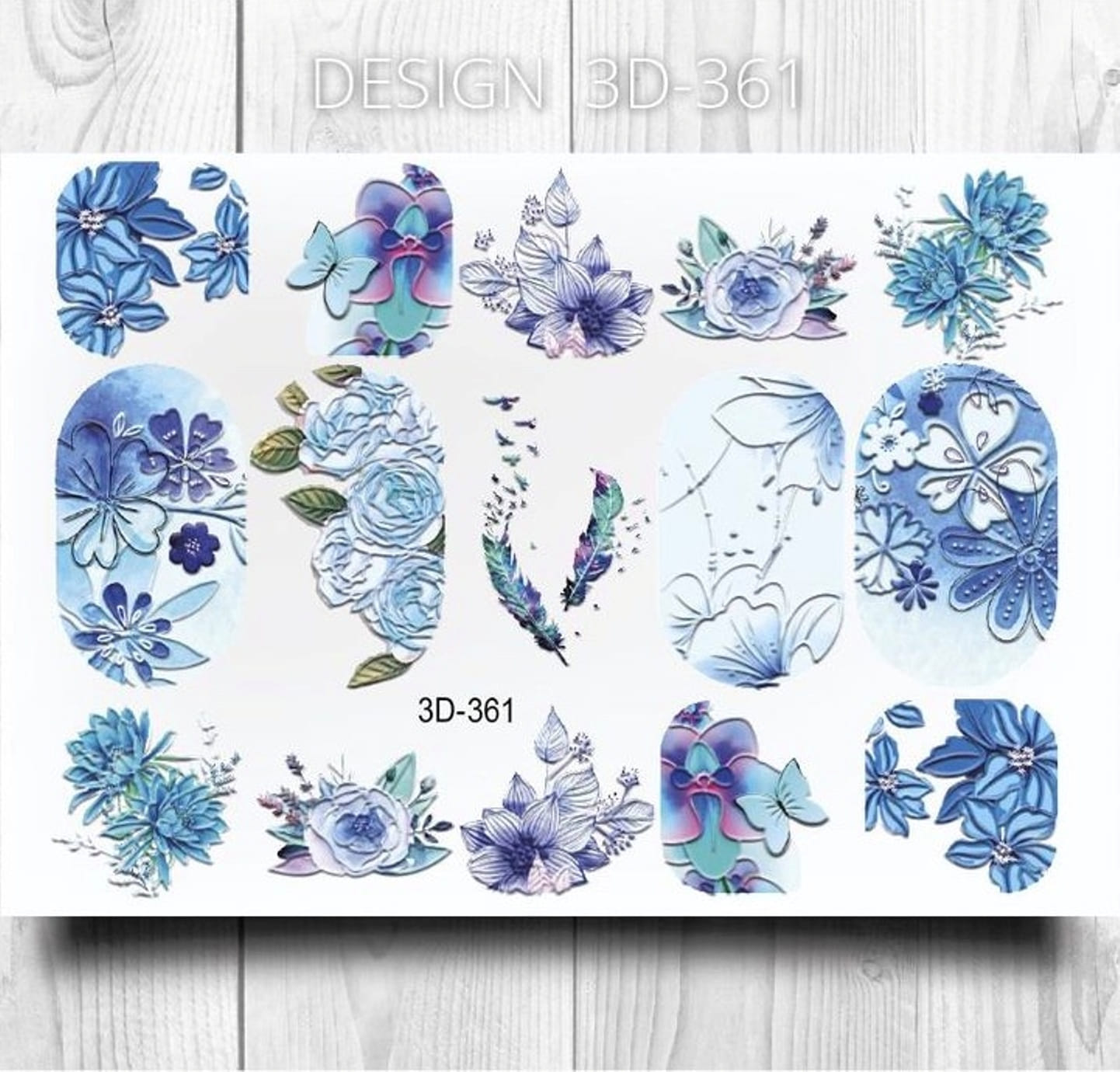 ANNA TKACHEVA Water decal 3D 361, 1 pz. Istruzioni per l'uso: 1. Effettuare una preparazione standard della lamina ungueale.2. Selezionare il modello appropriato, tagliare l'immagine alla dimensione dell'unghia. 3. Applicare la base,polimerizzare. Applicare uno strato sottile del semipermanente bianco, se richiesto dal design del water decal. Polimerizzare. 4. Applicare uno strato sottile della base. Non polimerizzare. 5. Mettere il water decal su un disco di cotone inumidito con acqua calda (non fredda!) Per circa 10-15 secondi. Spostarlo trasferendo la pellicola sull'unghia. Raddrizzare la pellicola, tirando leggermente verso l'alto il bordo libero. Distendere con cura le pieghe, estraendo i resti di aria e acqua con un panno morbido, un pennello piatto o con le dita. Polimerizzare a tempo pieno. (UV - 2 min, led -30-60 sec). 6. Utilizzando la lima fine, dall'alto verso il basso, rimuovere delicatamente la pellicola in eccesso dal bordo libero dell'unghia. 7. Coprire 2 volte con il top coat, ben sigillando il bordo libero.