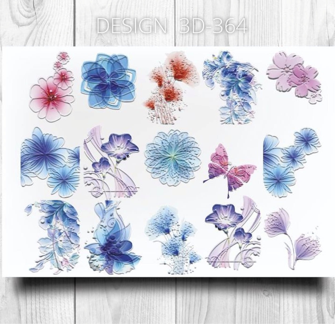 ANNA TKACHEVA Water decal 3D 364, 1 pz. Istruzioni per l'uso: 1. Effettuare una preparazione standard della lamina ungueale.2. Selezionare il modello appropriato, tagliare l'immagine alla dimensione dell'unghia. 3. Applicare la base,polimerizzare. Applicare uno strato sottile del semipermanente bianco, se richiesto dal design del water decal. Polimerizzare. 4. Applicare uno strato sottile della base. Non polimerizzare. 5. Mettere il water decal su un disco di cotone inumidito con acqua calda (non fredda!) Per circa 10-15 secondi. Spostarlo trasferendo la pellicola sull'unghia. Raddrizzare la pellicola, tirando leggermente verso l'alto il bordo libero. Distendere con cura le pieghe, estraendo i resti di aria e acqua con un panno morbido, un pennello piatto o con le dita. Polimerizzare a tempo pieno. (UV - 2 min, led -30-60 sec). 6. Utilizzando la lima fine, dall'alto verso il basso, rimuovere delicatamente la pellicola in eccesso dal bordo libero dell'unghia. 7. Coprire 2 volte con il top coat, ben sigillando il bordo libero.