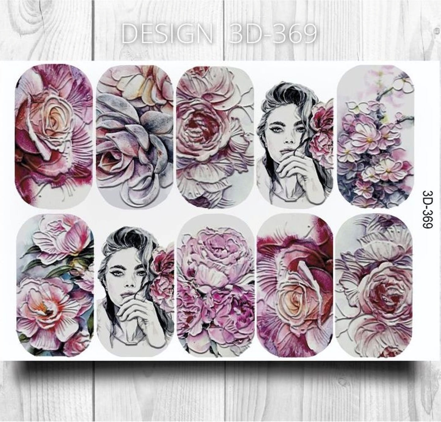 ANNA TKACHEVA Water decal 3D 369, 1 pz. Istruzioni per l'uso: 1. Effettuare una preparazione standard della lamina ungueale.2. Selezionare il modello appropriato, tagliare l'immagine alla dimensione dell'unghia. 3. Applicare la base,polimerizzare. Applicare uno strato sottile del semipermanente bianco, se richiesto dal design del water decal. Polimerizzare. 4. Applicare uno strato sottile della base. Non polimerizzare. 5. Mettere il water decal su un disco di cotone inumidito con acqua calda (non fredda!) Per circa 10-15 secondi. Spostarlo trasferendo la pellicola sull'unghia. Raddrizzare la pellicola, tirando leggermente verso l'alto il bordo libero. Distendere con cura le pieghe, estraendo i resti di aria e acqua con un panno morbido, un pennello piatto o con le dita. Polimerizzare a tempo pieno. (UV - 2 min, led -30-60 sec). 6. Utilizzando la lima fine, dall'alto verso il basso, rimuovere delicatamente la pellicola in eccesso dal bordo libero dell'unghia. 7. Coprire 2 volte con il top coat, ben sigillando il bordo libero.