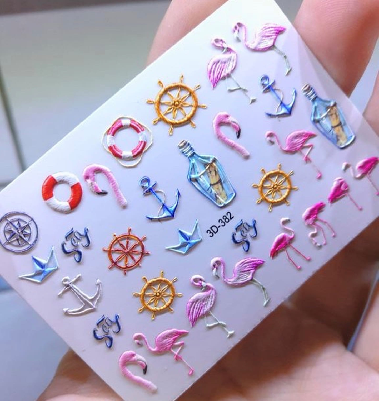 ANNA TKACHEVA Water decal 3D 382, 1 pz. Istruzioni per l'uso: 1. Effettuare una preparazione standard della lamina ungueale.2. Selezionare il modello appropriato, tagliare l'immagine alla dimensione dell'unghia. 3. Applicare la base,polimerizzare. Applicare uno strato sottile del semipermanente bianco, se richiesto dal design del water decal. Polimerizzare. 4. Applicare uno strato sottile della base. Non polimerizzare. 5. Mettere il water decal su un disco di cotone inumidito con acqua calda (non fredda!) Per circa 10-15 secondi. Spostarlo trasferendo la pellicola sull'unghia. Raddrizzare la pellicola, tirando leggermente verso l'alto il bordo libero. Distendere con cura le pieghe, estraendo i resti di aria e acqua con un panno morbido, un pennello piatto o con le dita. Polimerizzare a tempo pieno. (UV - 2 min, led -30-60 sec). 6. Utilizzando la lima fine, dall'alto verso il basso, rimuovere delicatamente la pellicola in eccesso dal bordo libero dell'unghia. 7. Coprire 2 volte con il top coat, ben sigillando il bordo libero.