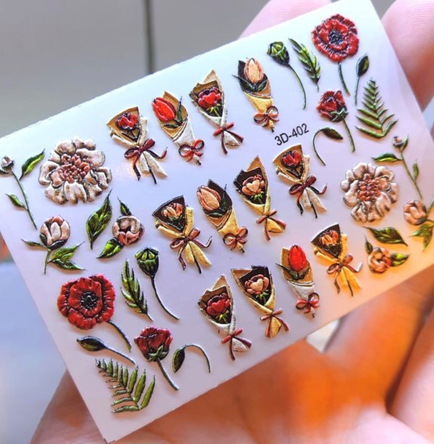ANNA TKACHEVA Water decal 3D 402, 1 pz. Istruzioni per l'uso: 1. Effettuare una preparazione standard della lamina ungueale.2. Selezionare il modello appropriato, tagliare l'immagine alla dimensione dell'unghia. 3. Applicare la base,polimerizzare. Applicare uno strato sottile del semipermanente bianco, se richiesto dal design del water decal. Polimerizzare. 4. Applicare uno strato sottile della base. Non polimerizzare. 5. Mettere il water decal su un disco di cotone inumidito con acqua calda (non fredda!) Per circa 10-15 secondi. Spostarlo trasferendo la pellicola sull'unghia. Raddrizzare la pellicola, tirando leggermente verso l'alto il bordo libero. Distendere con cura le pieghe, estraendo i resti di aria e acqua con un panno morbido, un pennello piatto o con le dita. Polimerizzare a tempo pieno. (UV - 2 min, led -30-60 sec). 6. Utilizzando la lima fine, dall'alto verso il basso, rimuovere delicatamente la pellicola in eccesso dal bordo libero dell'unghia. 7. Coprire 2 volte con il top coat, ben sigillando il bordo libero.