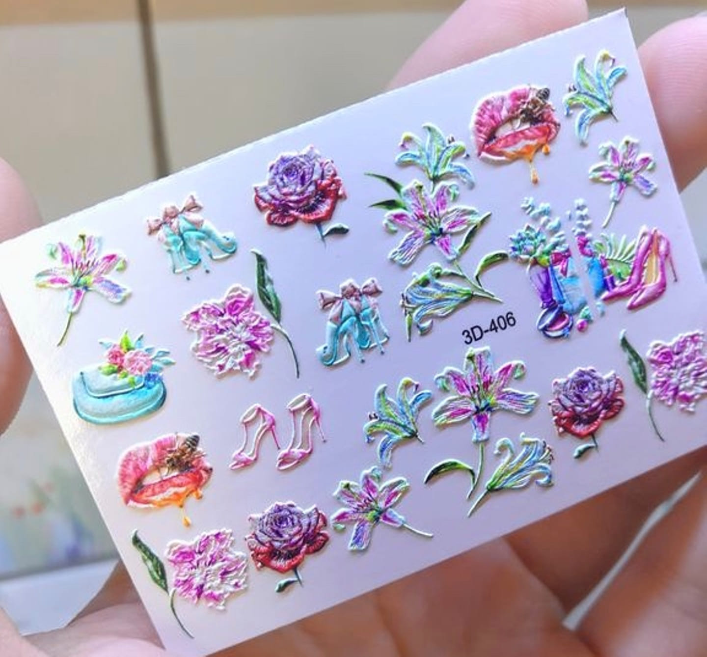ANNA TKACHEVA Water decal 3D 406, 1 pz. Istruzioni per l'uso: 1. Effettuare una preparazione standard della lamina ungueale.2. Selezionare il modello appropriato, tagliare l'immagine alla dimensione dell'unghia. 3. Applicare la base,polimerizzare. Applicare uno strato sottile del semipermanente bianco, se richiesto dal design del water decal. Polimerizzare. 4. Applicare uno strato sottile della base. Non polimerizzare. 5. Mettere il water decal su un disco di cotone inumidito con acqua calda (non fredda!) Per circa 10-15 secondi. Spostarlo trasferendo la pellicola sull'unghia. Raddrizzare la pellicola, tirando leggermente verso l'alto il bordo libero. Distendere con cura le pieghe, estraendo i resti di aria e acqua con un panno morbido, un pennello piatto o con le dita. Polimerizzare a tempo pieno. (UV - 2 min, led -30-60 sec). 6. Utilizzando la lima fine, dall'alto verso il basso, rimuovere delicatamente la pellicola in eccesso dal bordo libero dell'unghia. 7. Coprire 2 volte con il top coat, ben sigillando il bordo libero.