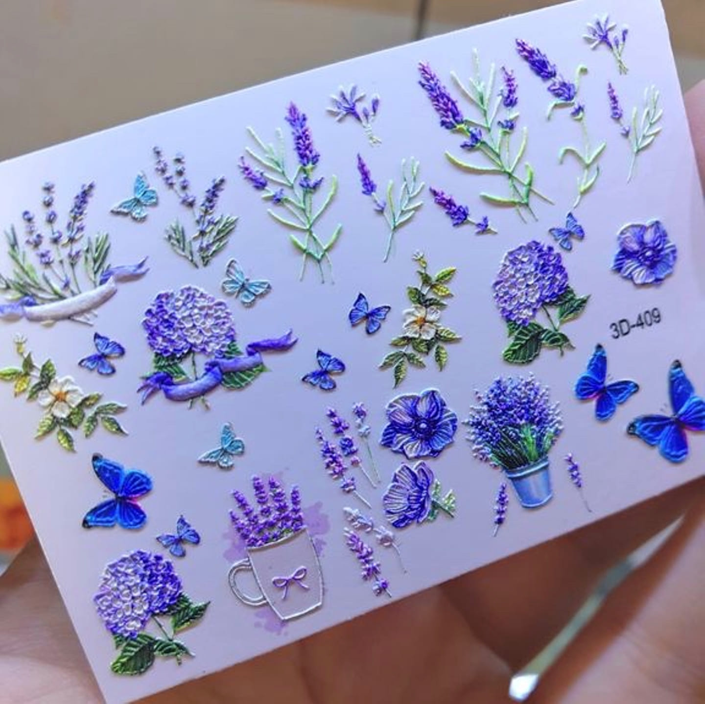 ANNA TKACHEVA Water decal 3D 409, 1 pz. Istruzioni per l'uso: 1. Effettuare una preparazione standard della lamina ungueale.2. Selezionare il modello appropriato, tagliare l'immagine alla dimensione dell'unghia. 3. Applicare la base,polimerizzare. Applicare uno strato sottile del semipermanente bianco, se richiesto dal design del water decal. Polimerizzare. 4. Applicare uno strato sottile della base. Non polimerizzare. 5. Mettere il water decal su un disco di cotone inumidito con acqua calda (non fredda!) Per circa 10-15 secondi. Spostarlo trasferendo la pellicola sull'unghia. Raddrizzare la pellicola, tirando leggermente verso l'alto il bordo libero. Distendere con cura le pieghe, estraendo i resti di aria e acqua con un panno morbido, un pennello piatto o con le dita. Polimerizzare a tempo pieno. (UV - 2 min, led -30-60 sec). 6. Utilizzando la lima fine, dall'alto verso il basso, rimuovere delicatamente la pellicola in eccesso dal bordo libero dell'unghia. 7. Coprire 2 volte con il top coat, ben sigillando il bordo libero.