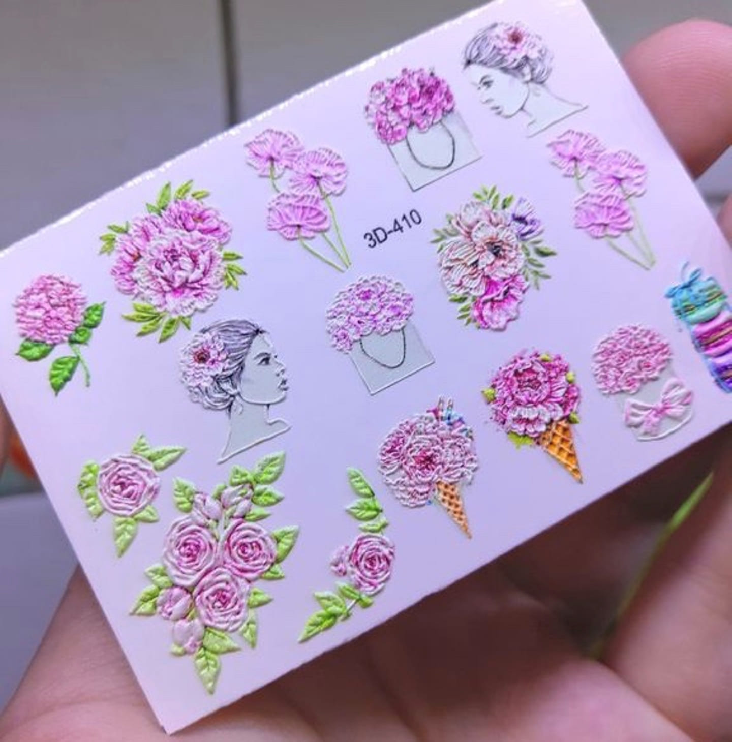 ANNA TKACHEVA Water decal 3D 410, 1 pz. Istruzioni per l'uso: 1. Effettuare una preparazione standard della lamina ungueale.2. Selezionare il modello appropriato, tagliare l'immagine alla dimensione dell'unghia. 3. Applicare la base,polimerizzare. Applicare uno strato sottile del semipermanente bianco, se richiesto dal design del water decal. Polimerizzare. 4. Applicare uno strato sottile della base. Non polimerizzare. 5. Mettere il water decal su un disco di cotone inumidito con acqua calda (non fredda!) Per circa 10-15 secondi. Spostarlo trasferendo la pellicola sull'unghia. Raddrizzare la pellicola, tirando leggermente verso l'alto il bordo libero. Distendere con cura le pieghe, estraendo i resti di aria e acqua con un panno morbido, un pennello piatto o con le dita. Polimerizzare a tempo pieno. (UV - 2 min, led -30-60 sec). 6. Utilizzando la lima fine, dall'alto verso il basso, rimuovere delicatamente la pellicola in eccesso dal bordo libero dell'unghia. 7. Coprire 2 volte con il top coat, ben sigillando il bordo libero.