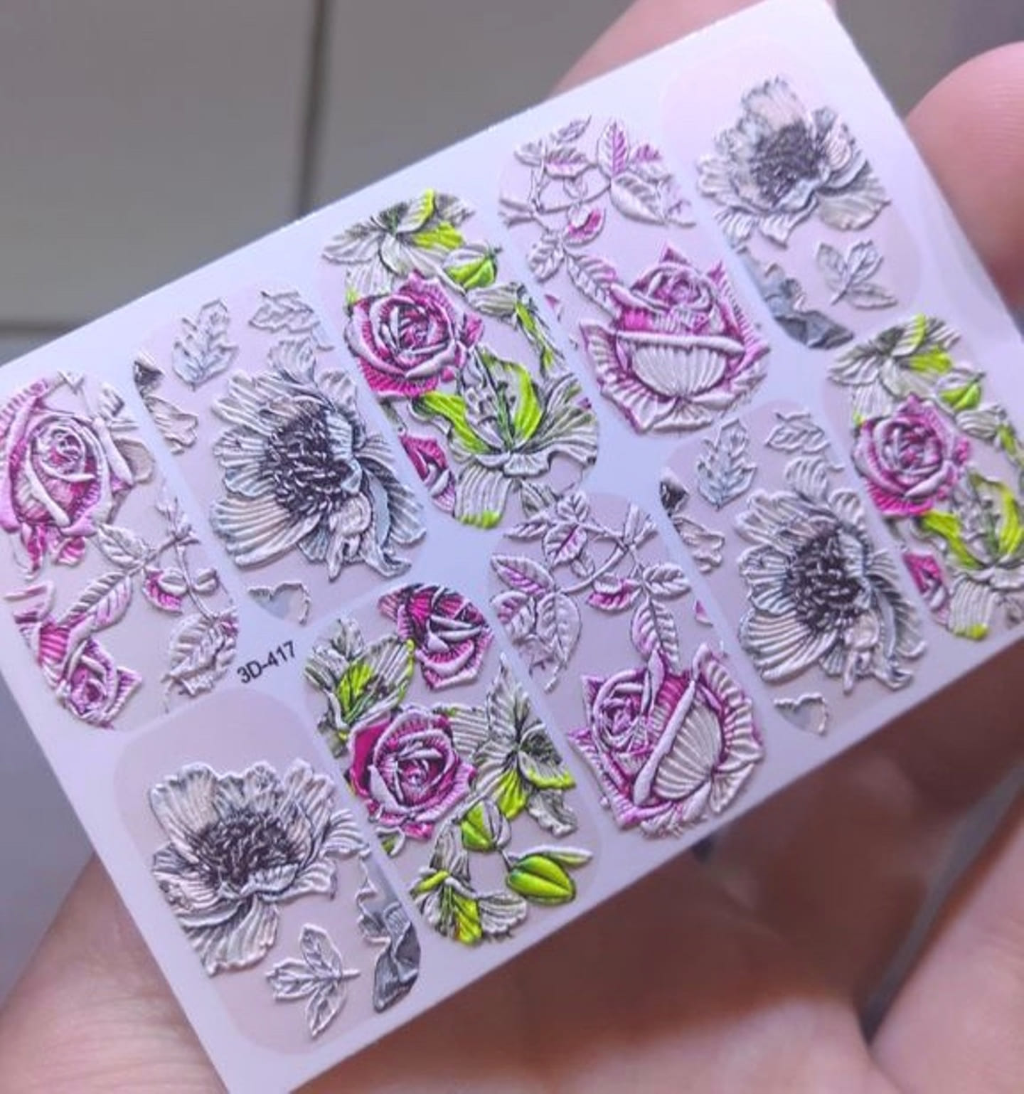 ANNA TKACHEVA Water decal 3D 417, 1 pz. Istruzioni per l'uso: 1. Effettuare una preparazione standard della lamina ungueale.2. Selezionare il modello appropriato, tagliare l'immagine alla dimensione dell'unghia. 3. Applicare la base,polimerizzare. Applicare uno strato sottile del semipermanente bianco, se richiesto dal design del water decal. Polimerizzare. 4. Applicare uno strato sottile della base. Non polimerizzare. 5. Mettere il water decal su un disco di cotone inumidito con acqua calda (non fredda!) Per circa 10-15 secondi. Spostarlo trasferendo la pellicola sull'unghia. Raddrizzare la pellicola, tirando leggermente verso l'alto il bordo libero. Distendere con cura le pieghe, estraendo i resti di aria e acqua con un panno morbido, un pennello piatto o con le dita. Polimerizzare a tempo pieno. (UV - 2 min, led -30-60 sec). 6. Utilizzando la lima fine, dall'alto verso il basso, rimuovere delicatamente la pellicola in eccesso dal bordo libero dell'unghia. 7. Coprire 2 volte con il top coat, ben sigillando il bordo libero.