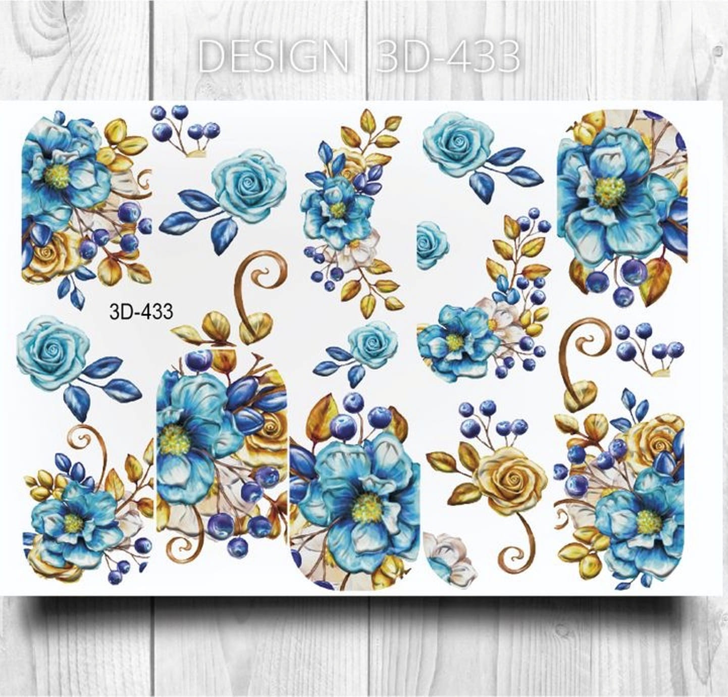 ANNA TKACHEVA Water decal 3D 433, 1 pz. Istruzioni per l'uso: 1. Effettuare una preparazione standard della lamina ungueale.2. Selezionare il modello appropriato, tagliare l'immagine alla dimensione dell'unghia. 3. Applicare la base,polimerizzare. Applicare uno strato sottile del semipermanente bianco, se richiesto dal design del water decal. Polimerizzare. 4. Applicare uno strato sottile della base. Non polimerizzare. 5. Mettere il water decal su un disco di cotone inumidito con acqua calda (non fredda!) Per circa 10-15 secondi. Spostarlo trasferendo la pellicola sull'unghia. Raddrizzare la pellicola, tirando leggermente verso l'alto il bordo libero. Distendere con cura le pieghe, estraendo i resti di aria e acqua con un panno morbido, un pennello piatto o con le dita. Polimerizzare a tempo pieno. (UV - 2 min, led -30-60 sec). 6. Utilizzando la lima fine, dall'alto verso il basso, rimuovere delicatamente la pellicola in eccesso dal bordo libero dell'unghia. 7. Coprire 2 volte con il top coat, ben sigillando il bordo libero.