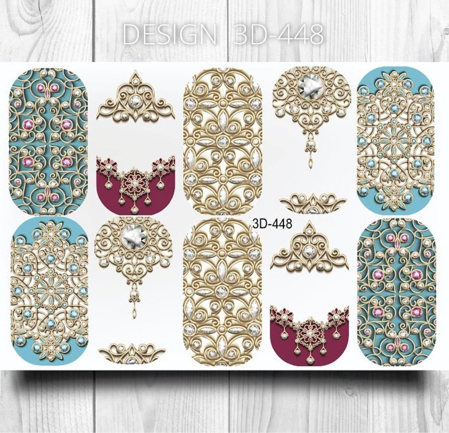 ANNA TKACHEVA Water decal 3D 448, 1 pz. Istruzioni per l'uso: 1. Effettuare una preparazione standard della lamina ungueale.2. Selezionare il modello appropriato, tagliare l'immagine alla dimensione dell'unghia. 3. Applicare la base,polimerizzare. Applicare uno strato sottile del semipermanente bianco, se richiesto dal design del water decal. Polimerizzare. 4. Applicare uno strato sottile della base. Non polimerizzare. 5. Mettere il water decal su un disco di cotone inumidito con acqua calda (non fredda!) Per circa 10-15 secondi. Spostarlo trasferendo la pellicola sull'unghia. Raddrizzare la pellicola, tirando leggermente verso l'alto il bordo libero. Distendere con cura le pieghe, estraendo i resti di aria e acqua con un panno morbido, un pennello piatto o con le dita. Polimerizzare a tempo pieno. (UV - 2 min, led -30-60 sec). 6. Utilizzando la lima fine, dall'alto verso il basso, rimuovere delicatamente la pellicola in eccesso dal bordo libero dell'unghia. 7. Coprire 2 volte con il top coat, ben sigillando il bordo libero.