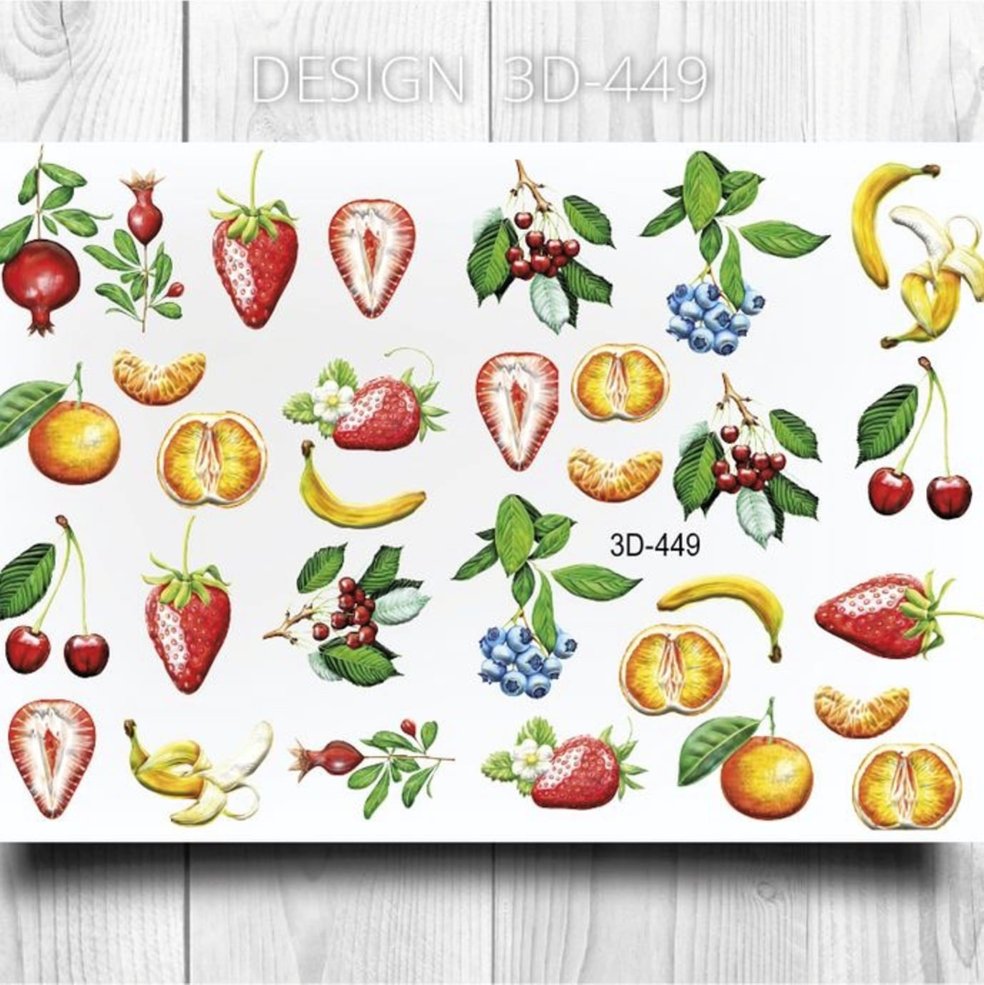 ANNA TKACHEVA Water decal 3D 449, 1 pz. Istruzioni per l'uso: 1. Effettuare una preparazione standard della lamina ungueale.2. Selezionare il modello appropriato, tagliare l'immagine alla dimensione dell'unghia. 3. Applicare la base,polimerizzare. Applicare uno strato sottile del semipermanente bianco, se richiesto dal design del water decal. Polimerizzare. 4. Applicare uno strato sottile della base. Non polimerizzare. 5. Mettere il water decal su un disco di cotone inumidito con acqua calda (non fredda!) Per circa 10-15 secondi. Spostarlo trasferendo la pellicola sull'unghia. Raddrizzare la pellicola, tirando leggermente verso l'alto il bordo libero. Distendere con cura le pieghe, estraendo i resti di aria e acqua con un panno morbido, un pennello piatto o con le dita. Polimerizzare a tempo pieno. (UV - 2 min, led -30-60 sec). 6. Utilizzando la lima fine, dall'alto verso il basso, rimuovere delicatamente la pellicola in eccesso dal bordo libero dell'unghia. 7. Coprire 2 volte con il top coat, ben sigillando il bordo libero.