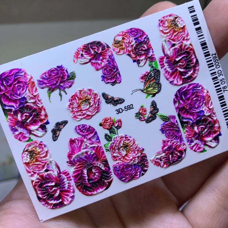 ANNA TKACHEVA Water decal 3D 592, 1 pz. Istruzioni per l'uso: 1. Effettuare una preparazione standard della lamina ungueale.2. Selezionare il modello appropriato, tagliare l'immagine alla dimensione dell'unghia. 3. Applicare la base,polimerizzare. Applicare uno strato sottile del semipermanente bianco, se richiesto dal design del water decal. Polimerizzare. 4. Applicare uno strato sottile della base. Non polimerizzare. 5. Mettere il water decal su un disco di cotone inumidito con acqua calda (non fredda!) Per circa 10-15 secondi. Spostarlo trasferendo la pellicola sull'unghia. Raddrizzare la pellicola, tirando leggermente verso l'alto il bordo libero. Distendere con cura le pieghe, estraendo i resti di aria e acqua con un panno morbido, un pennello piatto o con le dita. Polimerizzare a tempo pieno. (UV - 2 min, led -30-60 sec). 6. Utilizzando la lima fine, dall'alto verso il basso, rimuovere delicatamente la pellicola in eccesso dal bordo libero dell'unghia. 7. Coprire 2 volte con il top coat, ben sigillando il bordo libero.