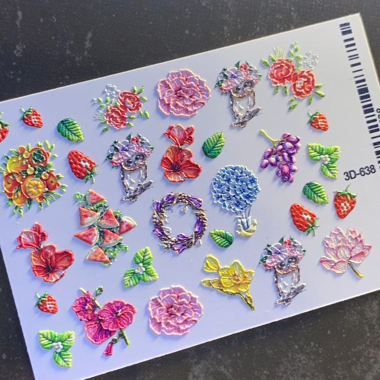 ANNA TKACHEVA Water decal 3D 638, 1 pz. Istruzioni per l'uso: 1. Effettuare una preparazione standard della lamina ungueale.2. Selezionare il modello appropriato, tagliare l'immagine alla dimensione dell'unghia. 3. Applicare la base,polimerizzare. Applicare uno strato sottile del semipermanente bianco, se richiesto dal design del water decal. Polimerizzare. 4. Applicare uno strato sottile della base. Non polimerizzare. 5. Mettere il water decal su un disco di cotone inumidito con acqua calda (non fredda!) Per circa 10-15 secondi. Spostarlo trasferendo la pellicola sull'unghia. Raddrizzare la pellicola, tirando leggermente verso l'alto il bordo libero. Distendere con cura le pieghe, estraendo i resti di aria e acqua con un panno morbido, un pennello piatto o con le dita. Polimerizzare a tempo pieno. (UV - 2 min, led -30-60 sec). 6. Utilizzando la lima fine, dall'alto verso il basso, rimuovere delicatamente la pellicola in eccesso dal bordo libero dell'unghia. 7. Coprire 2 volte con il top coat, ben sigillando il bordo libero.