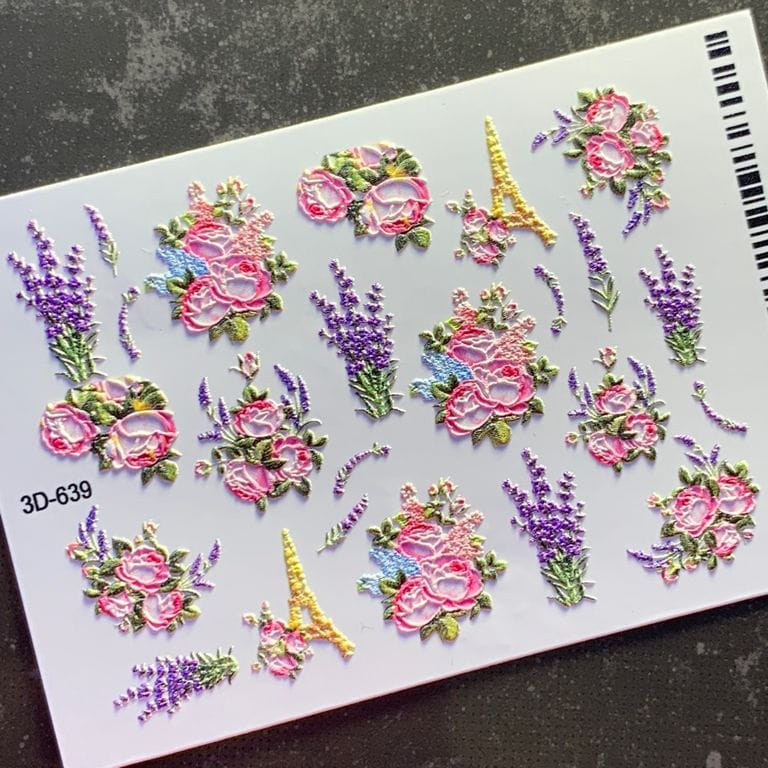 ANNA TKACHEVA Water decal 3D 639, 1 pz. Istruzioni per l'uso: 1. Effettuare una preparazione standard della lamina ungueale.2. Selezionare il modello appropriato, tagliare l'immagine alla dimensione dell'unghia. 3. Applicare la base,polimerizzare. Applicare uno strato sottile del semipermanente bianco, se richiesto dal design del water decal. Polimerizzare. 4. Applicare uno strato sottile della base. Non polimerizzare. 5. Mettere il water decal su un disco di cotone inumidito con acqua calda (non fredda!) Per circa 10-15 secondi. Spostarlo trasferendo la pellicola sull'unghia. Raddrizzare la pellicola, tirando leggermente verso l'alto il bordo libero. Distendere con cura le pieghe, estraendo i resti di aria e acqua con un panno morbido, un pennello piatto o con le dita. Polimerizzare a tempo pieno. (UV - 2 min, led -30-60 sec). 6. Utilizzando la lima fine, dall'alto verso il basso, rimuovere delicatamente la pellicola in eccesso dal bordo libero dell'unghia. 7. Coprire 2 volte con il top coat, ben sigillando il bordo libero.