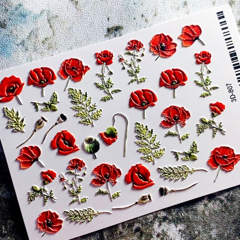 ANNA TKACHEVA Water decal 3D 807, 1 pz. Istruzioni per l'uso: 1. Effettuare una preparazione standard della lamina ungueale.2. Selezionare il modello appropriato, tagliare l'immagine alla dimensione dell'unghia. 3. Applicare la base,polimerizzare. Applicare uno strato sottile del semipermanente bianco, se richiesto dal design del water decal. Polimerizzare. 4. Applicare uno strato sottile della base. Non polimerizzare. 5. Mettere il water decal su un disco di cotone inumidito con acqua calda (non fredda!) Per circa 10-15 secondi. Spostarlo trasferendo la pellicola sull'unghia. Raddrizzare la pellicola, tirando leggermente verso l'alto il bordo libero. Distendere con cura le pieghe, estraendo i resti di aria e acqua con un panno morbido, un pennello piatto o con le dita. Polimerizzare a tempo pieno. (UV - 2 min, led -30-60 sec). 6. Utilizzando la lima fine, dall'alto verso il basso, rimuovere delicatamente la pellicola in eccesso dal bordo libero dell'unghia. 7. Coprire 2 volte con il top coat, ben sigillando il bordo libero.