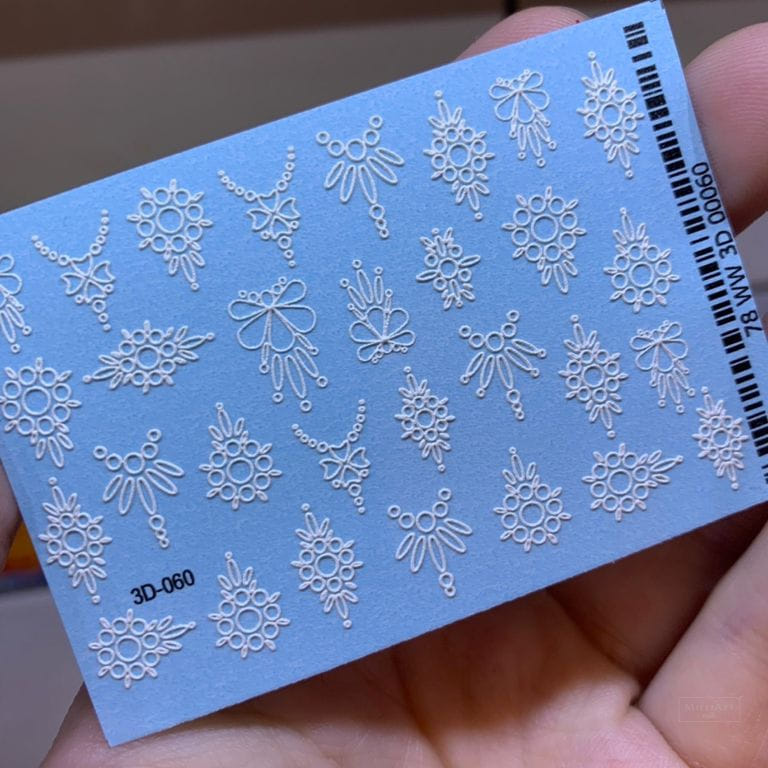 ANNA TKACHEVA Water decal ЗD 060 bianco, 1 pz. Istruzioni per l'uso: 1. Effettuare una preparazione standard della lamina ungueale.2. Selezionare il modello appropriato, tagliare l'immagine alla dimensione dell'unghia. 3. Applicare la base,polimerizzare. Applicare uno strato sottile del semipermanente bianco, se richiesto dal design del water decal. Polimerizzare. 4. Applicare uno strato sottile della base. Non polimerizzare. 5. Mettere il water decal su un disco di cotone inumidito con acqua calda (non fredda!) Per circa 10-15 secondi. Spostarlo trasferendo la pellicola sull'unghia. Raddrizzare la pellicola, tirando leggermente verso l'alto il bordo libero. Distendere con cura le pieghe, estraendo i resti di aria e acqua con un panno morbido, un pennello piatto o con le dita. Polimerizzare a tempo pieno. (UV - 2 min, led -30-60 sec). 6. Utilizzando la lima fine, dall'alto verso il basso, rimuovere delicatamente la pellicola in eccesso dal bordo libero dell'unghia. 7. Coprire 2 volte con il top coat, ben sigillando il bordo libero.