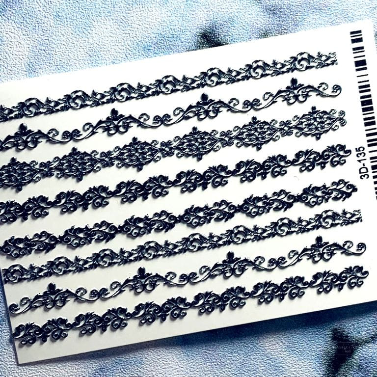 ANNA TKACHEVA Water decal ЗD 135 nero, 1 pz. Istruzioni per l'uso: 1. Effettuare una preparazione standard della lamina ungueale.2. Selezionare il modello appropriato, tagliare l'immagine alla dimensione dell'unghia. 3. Applicare la base,polimerizzare. Applicare uno strato sottile del semipermanente bianco, se richiesto dal design del water decal. Polimerizzare. 4. Applicare uno strato sottile della base. Non polimerizzare. 5. Mettere il water decal su un disco di cotone inumidito con acqua calda (non fredda!) Per circa 10-15 secondi. Spostarlo trasferendo la pellicola sull'unghia. Raddrizzare la pellicola, tirando leggermente verso l'alto il bordo libero. Distendere con cura le pieghe, estraendo i resti di aria e acqua con un panno morbido, un pennello piatto o con le dita. Polimerizzare a tempo pieno. (UV - 2 min, led -30-60 sec). 6. Utilizzando la lima fine, dall'alto verso il basso, rimuovere delicatamente la pellicola in eccesso dal bordo libero dell'unghia. 7. Coprire 2 volte con il top coat, ben sigillando il bordo libero.