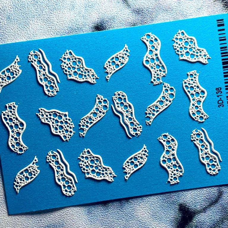 ANNA TKACHEVA Water decal ЗD 136 bianco, 1 pz. Istruzioni per l'uso: 1. Effettuare una preparazione standard della lamina ungueale.2. Selezionare il modello appropriato, tagliare l'immagine alla dimensione dell'unghia. 3. Applicare la base,polimerizzare. Applicare uno strato sottile del semipermanente bianco, se richiesto dal design del water decal. Polimerizzare. 4. Applicare uno strato sottile della base. Non polimerizzare. 5. Mettere il water decal su un disco di cotone inumidito con acqua calda (non fredda!) Per circa 10-15 secondi. Spostarlo trasferendo la pellicola sull'unghia. Raddrizzare la pellicola, tirando leggermente verso l'alto il bordo libero. Distendere con cura le pieghe, estraendo i resti di aria e acqua con un panno morbido, un pennello piatto o con le dita. Polimerizzare a tempo pieno. (UV - 2 min, led -30-60 sec). 6. Utilizzando la lima fine, dall'alto verso il basso, rimuovere delicatamente la pellicola in eccesso dal bordo libero dell'unghia. 7. Coprire 2 volte con il top coat, ben sigillando il bordo libero.