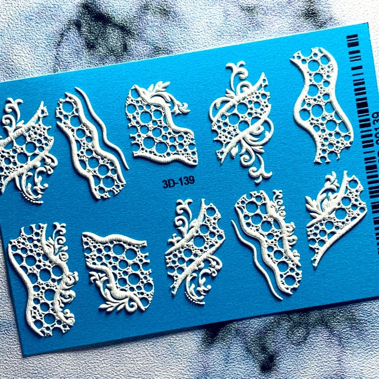 ANNA TKACHEVA Water decal ЗD 139 bianco, 1 pz. Istruzioni per l'uso: 1. Effettuare una preparazione standard della lamina ungueale.2. Selezionare il modello appropriato, tagliare l'immagine alla dimensione dell'unghia. 3. Applicare la base,polimerizzare. Applicare uno strato sottile del semipermanente bianco, se richiesto dal design del water decal. Polimerizzare. 4. Applicare uno strato sottile della base. Non polimerizzare. 5. Mettere il water decal su un disco di cotone inumidito con acqua calda (non fredda!) Per circa 10-15 secondi. Spostarlo trasferendo la pellicola sull'unghia. Raddrizzare la pellicola, tirando leggermente verso l'alto il bordo libero. Distendere con cura le pieghe, estraendo i resti di aria e acqua con un panno morbido, un pennello piatto o con le dita. Polimerizzare a tempo pieno. (UV - 2 min, led -30-60 sec). 6. Utilizzando la lima fine, dall'alto verso il basso, rimuovere delicatamente la pellicola in eccesso dal bordo libero dell'unghia. 7. Coprire 2 volte con il top coat, ben sigillando il bordo libero.
