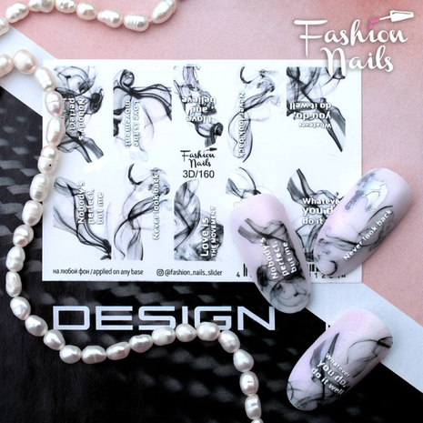 FASHION NAILS Water decal 3D #160, 1 pz. Istruzioni per l'uso: 1. Effettuare una preparazione standard della lamina ungueale.2. Selezionare il modello appropriato, tagliare l'immagine alla dimensione dell'unghia. 3. Applicare la base,polimerizzare. Applicare uno strato sottile del semipermanente bianco, se richiesto dal design del water decal. Polimerizzare. 4. Applicare uno strato sottile della base. Non polimerizzare. 5. Mettere il water decal su un disco di cotone inumidito con acqua calda (non fredda!) Per circa 10-15 secondi. Spostarlo trasferendo la pellicola sull'unghia. Raddrizzare la pellicola, tirando leggermente verso l'alto il bordo libero. Distendere con cura le pieghe, estraendo i resti di aria e acqua con un panno morbido, un pennello piatto o con le dita. Polimerizzare a tempo pieno. (UV - 2 min, led -30-60 sec). 6. Utilizzando la lima fine, dall'alto verso il basso, rimuovere delicatamente la pellicola in eccesso dal bordo libero dell'unghia. 7. Coprire 2 volte con il top coat, ben sigillando il bordo libero.