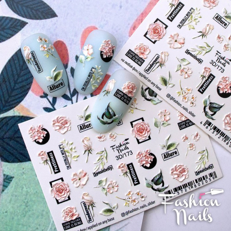 FASHION NAILS Water decal 3D #173, 1 pz. Istruzioni per l'uso: 1. Effettuare una preparazione standard della lamina ungueale.2. Selezionare il modello appropriato, tagliare l'immagine alla dimensione dell'unghia. 3. Applicare la base,polimerizzare. Applicare uno strato sottile del semipermanente bianco, se richiesto dal design del water decal. Polimerizzare. 4. Applicare uno strato sottile della base. Non polimerizzare. 5. Mettere il water decal su un disco di cotone inumidito con acqua calda (non fredda!) Per circa 10-15 secondi. Spostarlo trasferendo la pellicola sull'unghia. Raddrizzare la pellicola, tirando leggermente verso l'alto il bordo libero. Distendere con cura le pieghe, estraendo i resti di aria e acqua con un panno morbido, un pennello piatto o con le dita. Polimerizzare a tempo pieno. (UV - 2 min, led -30-60 sec). 6. Utilizzando la lima fine, dall'alto verso il basso, rimuovere delicatamente la pellicola in eccesso dal bordo libero dell'unghia. 7. Coprire 2 volte con il top coat, ben sigillando il bordo libero.