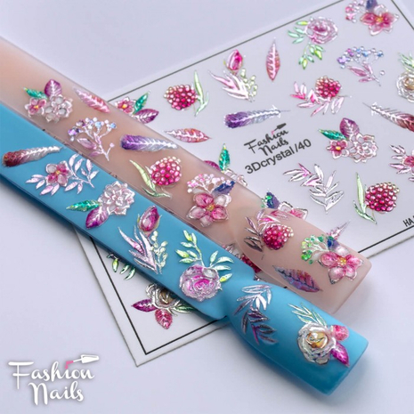 FASHION NAILS Water decal 3D crystal #40, 1 pz. Istruzioni per l'uso: 1. Effettuare una preparazione standard della lamina ungueale.2. Selezionare il modello appropriato, tagliare l'immagine alla dimensione dell'unghia. 3. Applicare la base,polimerizzare. Applicare uno strato sottile del semipermanente bianco, se richiesto dal design del water decal. Polimerizzare. 4. Applicare uno strato sottile della base. Non polimerizzare. 5. Mettere il water decal su un disco di cotone inumidito con acqua calda (non fredda!) Per circa 10-15 secondi. Spostarlo trasferendo la pellicola sull'unghia. Raddrizzare la pellicola, tirando leggermente verso l'alto il bordo libero. Distendere con cura le pieghe, estraendo i resti di aria e acqua con un panno morbido, un pennello piatto o con le dita. Polimerizzare a tempo pieno. (UV - 2 min, led -30-60 sec). 6. Utilizzando la lima fine, dall'alto verso il basso, rimuovere delicatamente la pellicola in eccesso dal bordo libero dell'unghia. 7. Coprire 2 volte con il top coat, ben sigillando il bordo libero.