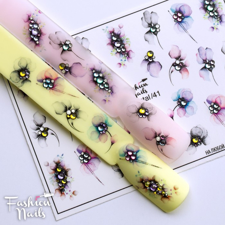 FASHION NAILS Water decal 3D crystal #41, 1 pz. Istruzioni per l'uso: 1. Effettuare una preparazione standard della lamina ungueale.2. Selezionare il modello appropriato, tagliare l'immagine alla dimensione dell'unghia. 3. Applicare la base,polimerizzare. Applicare uno strato sottile del semipermanente bianco, se richiesto dal design del water decal. Polimerizzare. 4. Applicare uno strato sottile della base. Non polimerizzare. 5. Mettere il water decal su un disco di cotone inumidito con acqua calda (non fredda!) Per circa 10-15 secondi. Spostarlo trasferendo la pellicola sull'unghia. Raddrizzare la pellicola, tirando leggermente verso l'alto il bordo libero. Distendere con cura le pieghe, estraendo i resti di aria e acqua con un panno morbido, un pennello piatto o con le dita. Polimerizzare a tempo pieno. (UV - 2 min, led -30-60 sec). 6. Utilizzando la lima fine, dall'alto verso il basso, rimuovere delicatamente la pellicola in eccesso dal bordo libero dell'unghia. 7. Coprire 2 volte con il top coat, ben sigillando il bordo libero.