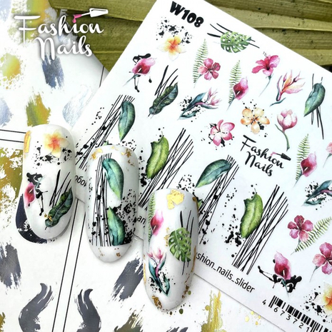 FASHION NAILS Water decal WHITE 108, 1 pz. Istruzioni per l'uso: 1. Effettuare una preparazione standard della lamina ungueale.2. Selezionare il modello appropriato, tagliare l'immagine alla dimensione dell'unghia. 3. Applicare la base,polimerizzare. Applicare uno strato sottile del semipermanente bianco, se richiesto dal design del water decal. Polimerizzare. 4. Applicare uno strato sottile della base. Non polimerizzare. 5. Mettere il water decal su un disco di cotone inumidito con acqua calda (non fredda!) Per circa 10-15 secondi. Spostarlo trasferendo la pellicola sull'unghia. Raddrizzare la pellicola, tirando leggermente verso l'alto il bordo libero. Distendere con cura le pieghe, estraendo i resti di aria e acqua con un panno morbido, un pennello piatto o con le dita. Polimerizzare a tempo pieno. (UV - 2 min, led -30-60 sec). 6. Utilizzando la lima fine, dall'alto verso il basso, rimuovere delicatamente la pellicola in eccesso dal bordo libero dell'unghia. 7. Coprire 2 volte con il top coat, ben sigillando il bordo libero.