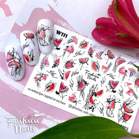 FASHION NAILS Water decal WHITE 111, 1 pz. Istruzioni per l'uso: 1. Effettuare una preparazione standard della lamina ungueale.2. Selezionare il modello appropriato, tagliare l'immagine alla dimensione dell'unghia. 3. Applicare la base,polimerizzare. Applicare uno strato sottile del semipermanente bianco, se richiesto dal design del water decal. Polimerizzare. 4. Applicare uno strato sottile della base. Non polimerizzare. 5. Mettere il water decal su un disco di cotone inumidito con acqua calda (non fredda!) Per circa 10-15 secondi. Spostarlo trasferendo la pellicola sull'unghia. Raddrizzare la pellicola, tirando leggermente verso l'alto il bordo libero. Distendere con cura le pieghe, estraendo i resti di aria e acqua con un panno morbido, un pennello piatto o con le dita. Polimerizzare a tempo pieno. (UV - 2 min, led -30-60 sec). 6. Utilizzando la lima fine, dall'alto verso il basso, rimuovere delicatamente la pellicola in eccesso dal bordo libero dell'unghia. 7. Coprire 2 volte con il top coat, ben sigillando il bordo libero.