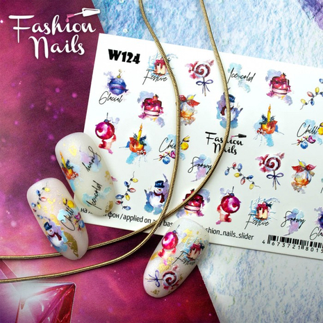 FASHION NAILS Water decal WHITE 124, 1 pz. Istruzioni per l'uso: 1. Effettuare una preparazione standard della lamina ungueale.2. Selezionare il modello appropriato, tagliare l'immagine alla dimensione dell'unghia. 3. Applicare la base,polimerizzare. Applicare uno strato sottile del semipermanente bianco, se richiesto dal design del water decal. Polimerizzare. 4. Applicare uno strato sottile della base. Non polimerizzare. 5. Mettere il water decal su un disco di cotone inumidito con acqua calda (non fredda!) Per circa 10-15 secondi. Spostarlo trasferendo la pellicola sull'unghia. Raddrizzare la pellicola, tirando leggermente verso l'alto il bordo libero. Distendere con cura le pieghe, estraendo i resti di aria e acqua con un panno morbido, un pennello piatto o con le dita. Polimerizzare a tempo pieno. (UV - 2 min, led -30-60 sec). 6. Utilizzando la lima fine, dall'alto verso il basso, rimuovere delicatamente la pellicola in eccesso dal bordo libero dell'unghia. 7. Coprire 2 volte con il top coat, ben sigillando il bordo libero.
