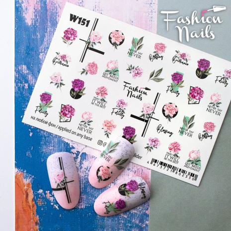 FASHION NAILS Water decal WHITE 151, 1 pz. Istruzioni per l'uso: 1. Effettuare una preparazione standard della lamina ungueale.2. Selezionare il modello appropriato, tagliare l'immagine alla dimensione dell'unghia. 3. Applicare la base,polimerizzare. Applicare uno strato sottile del semipermanente bianco, se richiesto dal design del water decal. Polimerizzare. 4. Applicare uno strato sottile della base. Non polimerizzare. 5. Mettere il water decal su un disco di cotone inumidito con acqua calda (non fredda!) Per circa 10-15 secondi. Spostarlo trasferendo la pellicola sull'unghia. Raddrizzare la pellicola, tirando leggermente verso l'alto il bordo libero. Distendere con cura le pieghe, estraendo i resti di aria e acqua con un panno morbido, un pennello piatto o con le dita. Polimerizzare a tempo pieno. (UV - 2 min, led -30-60 sec). 6. Utilizzando la lima fine, dall'alto verso il basso, rimuovere delicatamente la pellicola in eccesso dal bordo libero dell'unghia. 7. Coprire 2 volte con il top coat, ben sigillando il bordo libero.