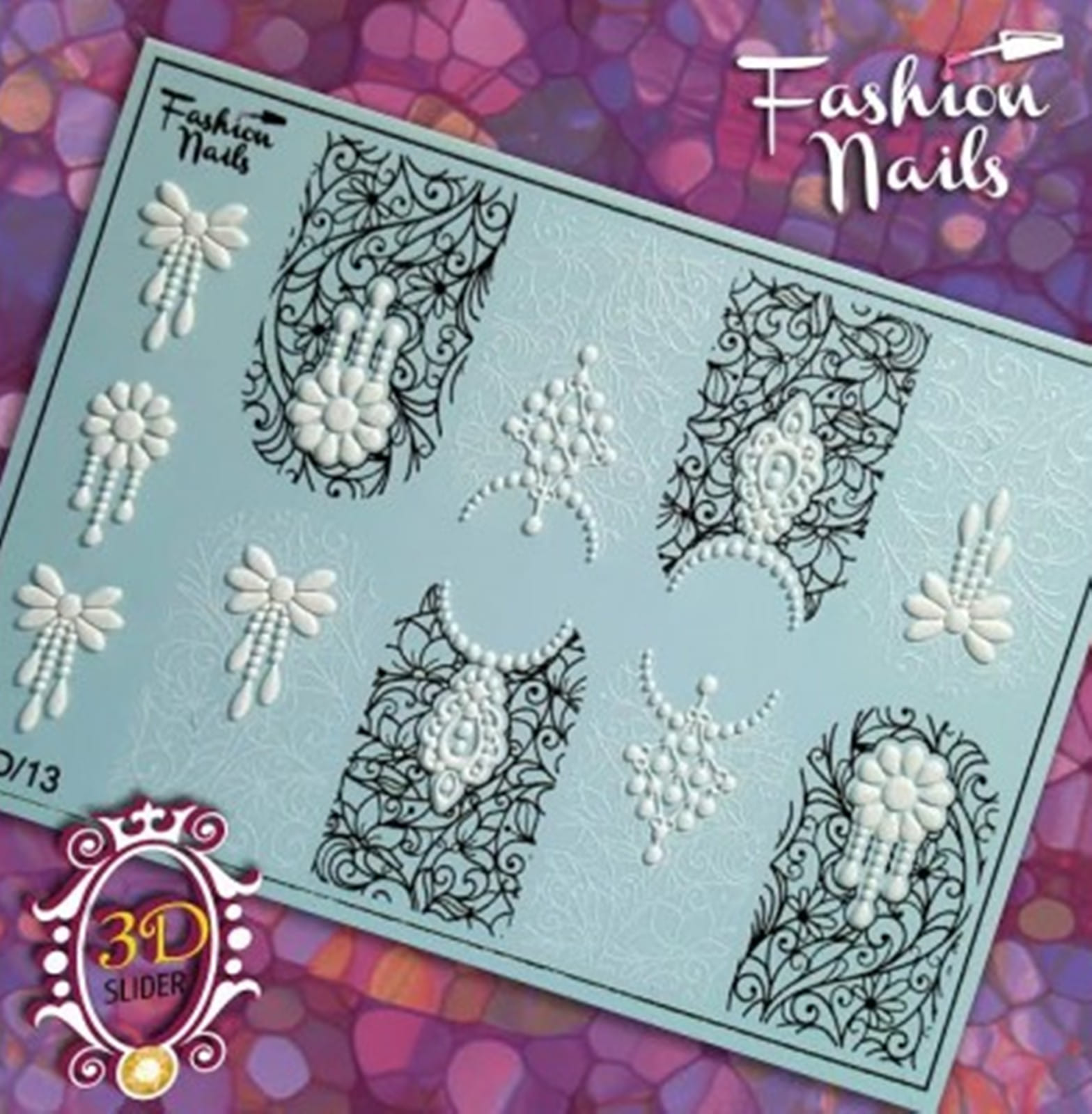 FASHION NAILS Water decal 3D #13, 1 pz. Istruzioni per l'uso: 1. Effettuare una preparazione standard della lamina ungueale.2. Selezionare il modello appropriato, tagliare l'immagine alla dimensione dell'unghia. 3. Applicare la base,polimerizzare. Applicare uno strato sottile del semipermanente bianco, se richiesto dal design del water decal. Polimerizzare. 4. Applicare uno strato sottile della base. Non polimerizzare. 5. Mettere il water decal su un disco di cotone inumidito con acqua calda (non fredda!) Per circa 10-15 secondi. Spostarlo trasferendo la pellicola sull'unghia. Raddrizzare la pellicola, tirando leggermente verso l'alto il bordo libero. Distendere con cura le pieghe, estraendo i resti di aria e acqua con un panno morbido, un pennello piatto o con le dita. Polimerizzare a tempo pieno. (UV - 2 min, led -30-60 sec). 6. Utilizzando la lima fine, dall'alto verso il basso, rimuovere delicatamente la pellicola in eccesso dal bordo libero dell'unghia. 7. Coprire 2 volte con il top coat, ben sigillando il bordo libero.