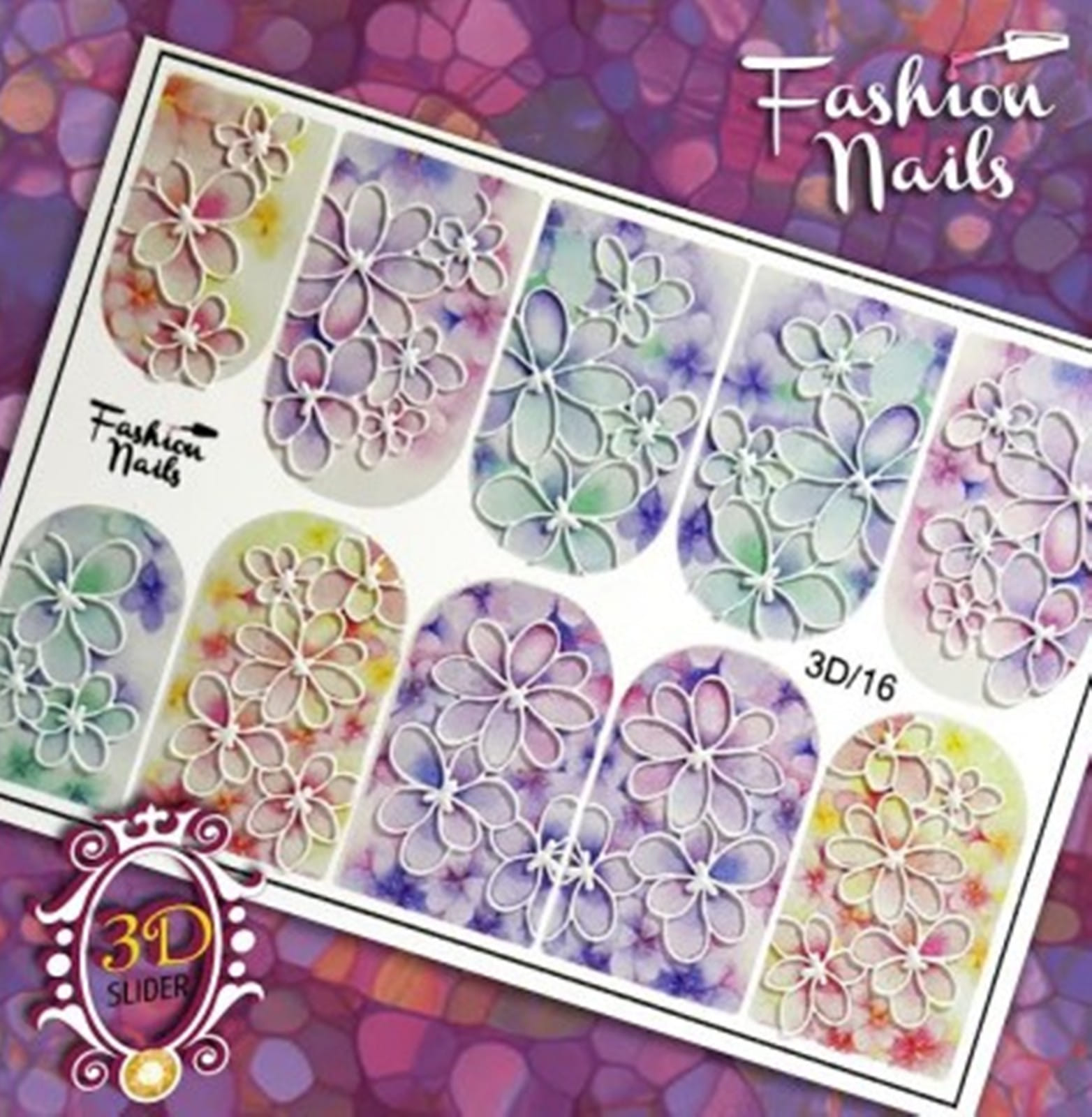 FASHION NAILS Water decal 3D #16, 1 pz. Istruzioni per l'uso: 1. Effettuare una preparazione standard della lamina ungueale.2. Selezionare il modello appropriato, tagliare l'immagine alla dimensione dell'unghia. 3. Applicare la base,polimerizzare. Applicare uno strato sottile del semipermanente bianco, se richiesto dal design del water decal. Polimerizzare. 4. Applicare uno strato sottile della base. Non polimerizzare. 5. Mettere il water decal su un disco di cotone inumidito con acqua calda (non fredda!) Per circa 10-15 secondi. Spostarlo trasferendo la pellicola sull'unghia. Raddrizzare la pellicola, tirando leggermente verso l'alto il bordo libero. Distendere con cura le pieghe, estraendo i resti di aria e acqua con un panno morbido, un pennello piatto o con le dita. Polimerizzare a tempo pieno. (UV - 2 min, led -30-60 sec). 6. Utilizzando la lima fine, dall'alto verso il basso, rimuovere delicatamente la pellicola in eccesso dal bordo libero dell'unghia. 7. Coprire 2 volte con il top coat, ben sigillando il bordo libero.