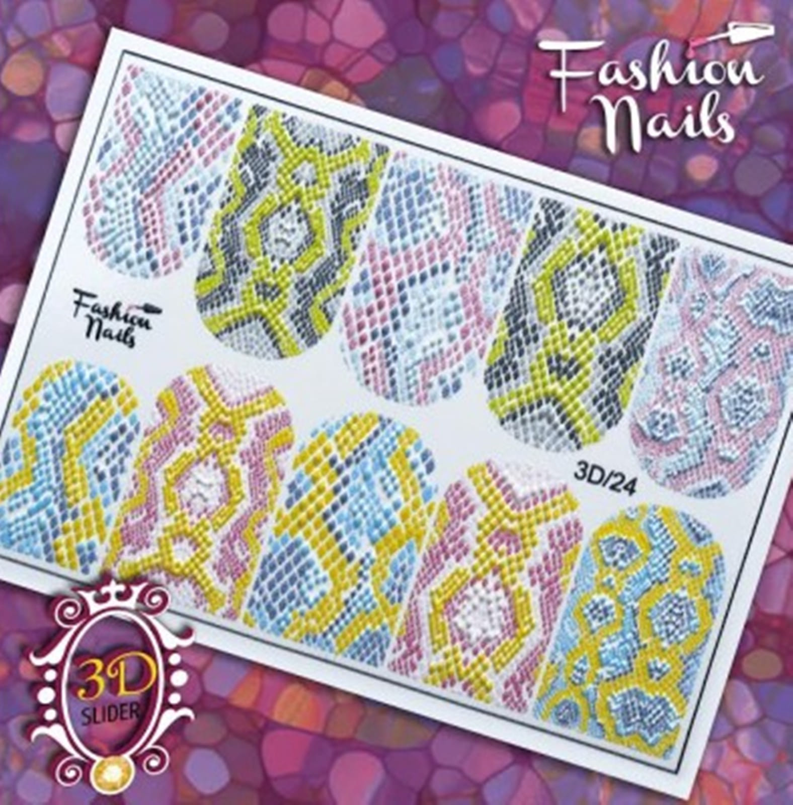 FASHION NAILS Water decal 3D #24, 1 pz. Istruzioni per l'uso: 1. Effettuare una preparazione standard della lamina ungueale.2. Selezionare il modello appropriato, tagliare l'immagine alla dimensione dell'unghia. 3. Applicare la base,polimerizzare. Applicare uno strato sottile del semipermanente bianco, se richiesto dal design del water decal. Polimerizzare. 4. Applicare uno strato sottile della base. Non polimerizzare. 5. Mettere il water decal su un disco di cotone inumidito con acqua calda (non fredda!) Per circa 10-15 secondi. Spostarlo trasferendo la pellicola sull'unghia. Raddrizzare la pellicola, tirando leggermente verso l'alto il bordo libero. Distendere con cura le pieghe, estraendo i resti di aria e acqua con un panno morbido, un pennello piatto o con le dita. Polimerizzare a tempo pieno. (UV - 2 min, led -30-60 sec). 6. Utilizzando la lima fine, dall'alto verso il basso, rimuovere delicatamente la pellicola in eccesso dal bordo libero dell'unghia. 7. Coprire 2 volte con il top coat, ben sigillando il bordo libero.